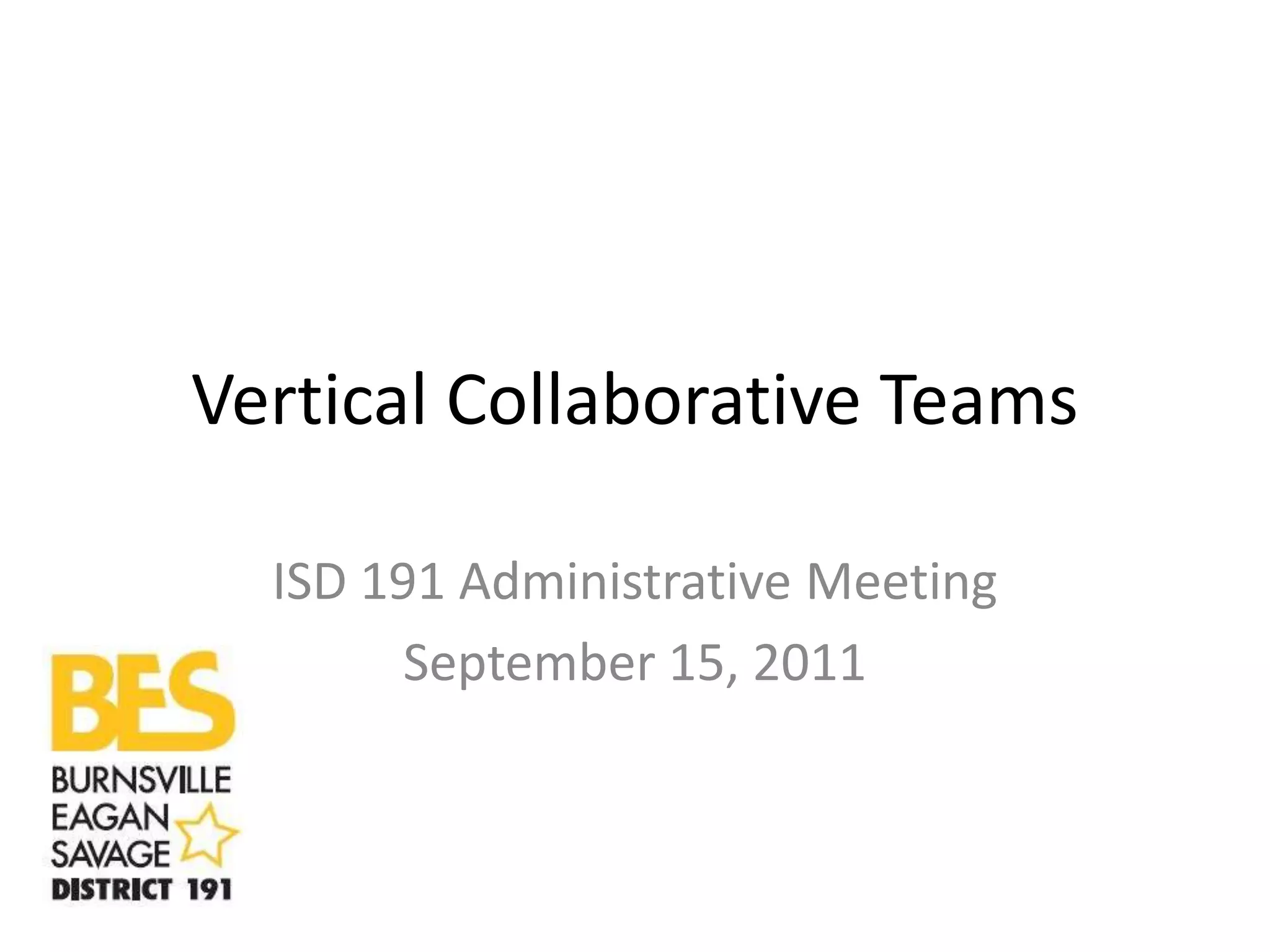 The document discusses vertical collaborative teams in ISD 191. It outlines the objectives of revisiting norms, reviewing the school improvement plan (SIP) and professional development (PD) processes, analyzing student achievement data, and establishing protocols for vertical team sharing. Teams will use constructivist listening, analyze data, develop SIP/PD plans and timelines, differentiate between PD and team meetings, and participate in district PD days focusing on curriculum development.
