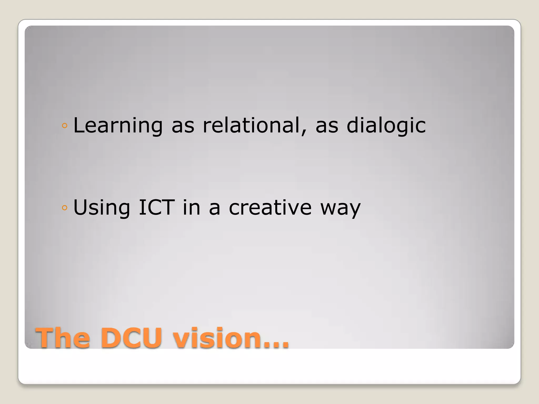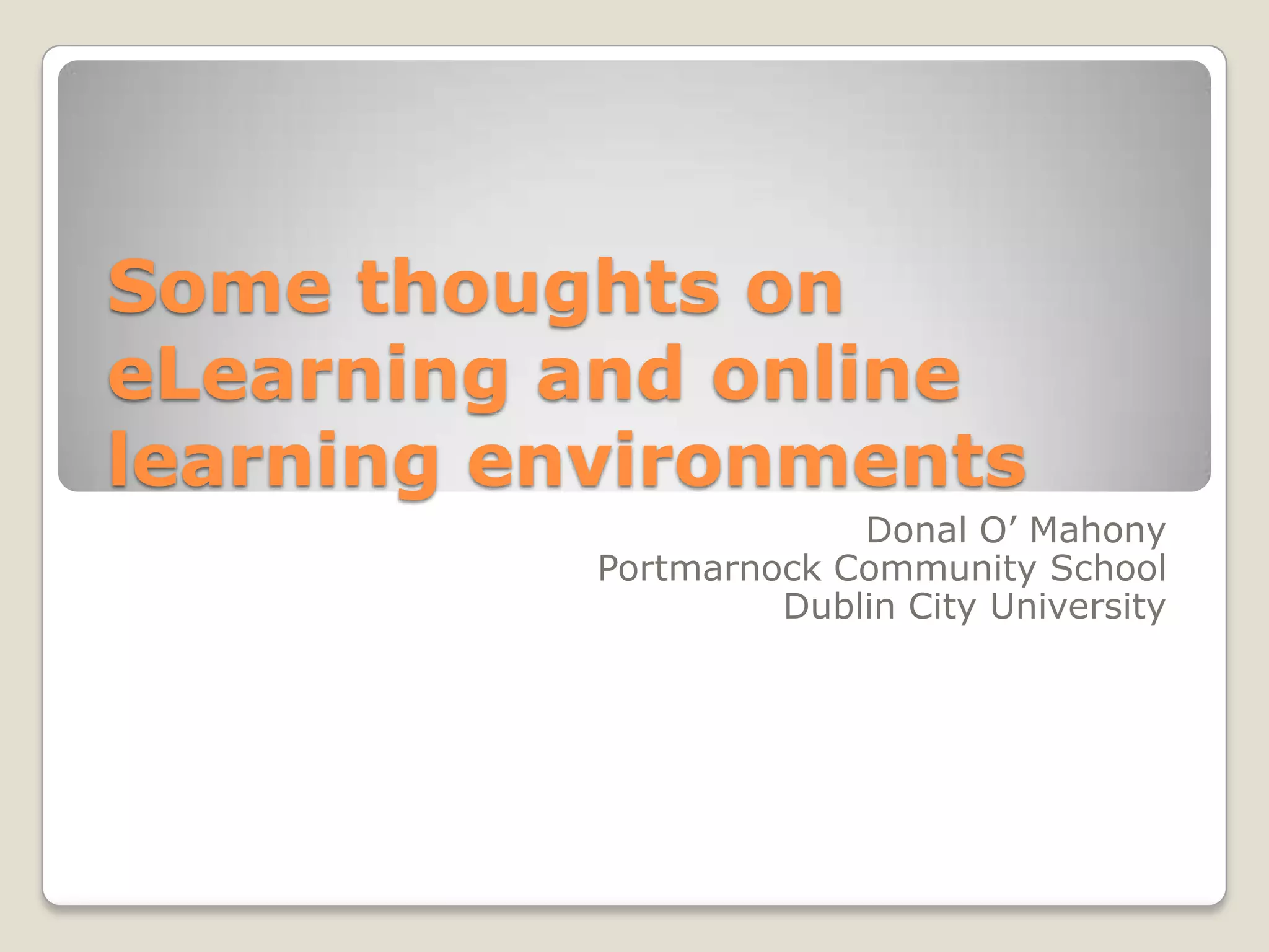 This document discusses eLearning and online learning environments. It focuses on the use of Moodle, an online learning platform, at Portmarnock Community School in Dublin. It outlines the key players in Ireland's ICT framework for education and examines how Moodle can be used to enhance teaching and learning by moving away from traditional content delivery methods towards more collaborative and communicative approaches using social software and web 2.0 technologies. Specific examples are provided of how Moodle has been implemented and some of the benefits and challenges of introducing online learning environments in schools.