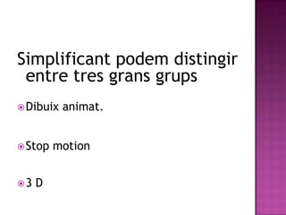 Dibuixos animats Sónuna producció audiovisual, normalment realitzats a mà dirigits sobretot al cinema i a la televisió. Conten qualsevol tipus d'història o de guió. Es dibuixa moviment a moviment les seqüències. I a l’ajuntar-les es Simula el moviment. http://www.youtube.com/watch?v=jUn3z5QW0Js&feature=related