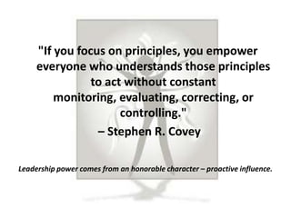 Dr. Stephen R. Covey is recognized as one of Time magazine's most influential Americans and an expert in leadership and organizational development. He outlines the key principles of principle-centered leadership, which include empowering others through shared principles rather than constant control. Covey's model has five levels - personal, interpersonal, managerial, organizational, and societal - and emphasizes trust, continued learning, service to others, and maintaining a positive outlook. The document discusses how Covey's theory can be applied to school administration through shared vision, trust-building, and empowering teachers.