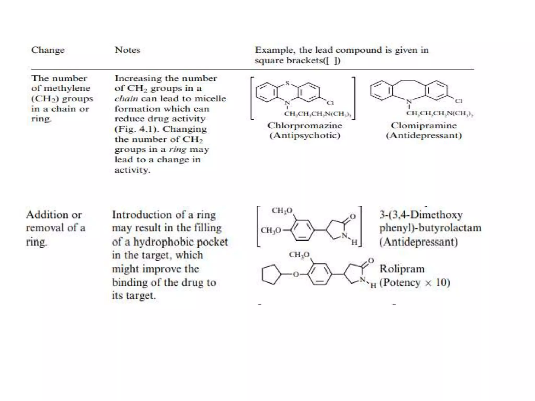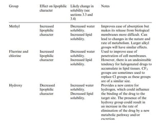 This document discusses structure-activity relationships (SARs) and quantitative structure-activity relationships (QSARs) in drug design. It explains that compounds with similar structures to an active drug are often biologically active as well, and studying their SARs can provide information about what parts of the structure are responsible for the drug's effects and side effects. QSARs attempt to mathematically relate biological activity to measurable physicochemical parameters like lipophilicity, electronic effects, and steric effects. Parameters like partition coefficients, Hammett constants, and Taft steric constants are used to represent these properties in equations. Hansch analysis and Craig plots are also discussed as methods to predict potential drug activity based on these quantitative relationships.