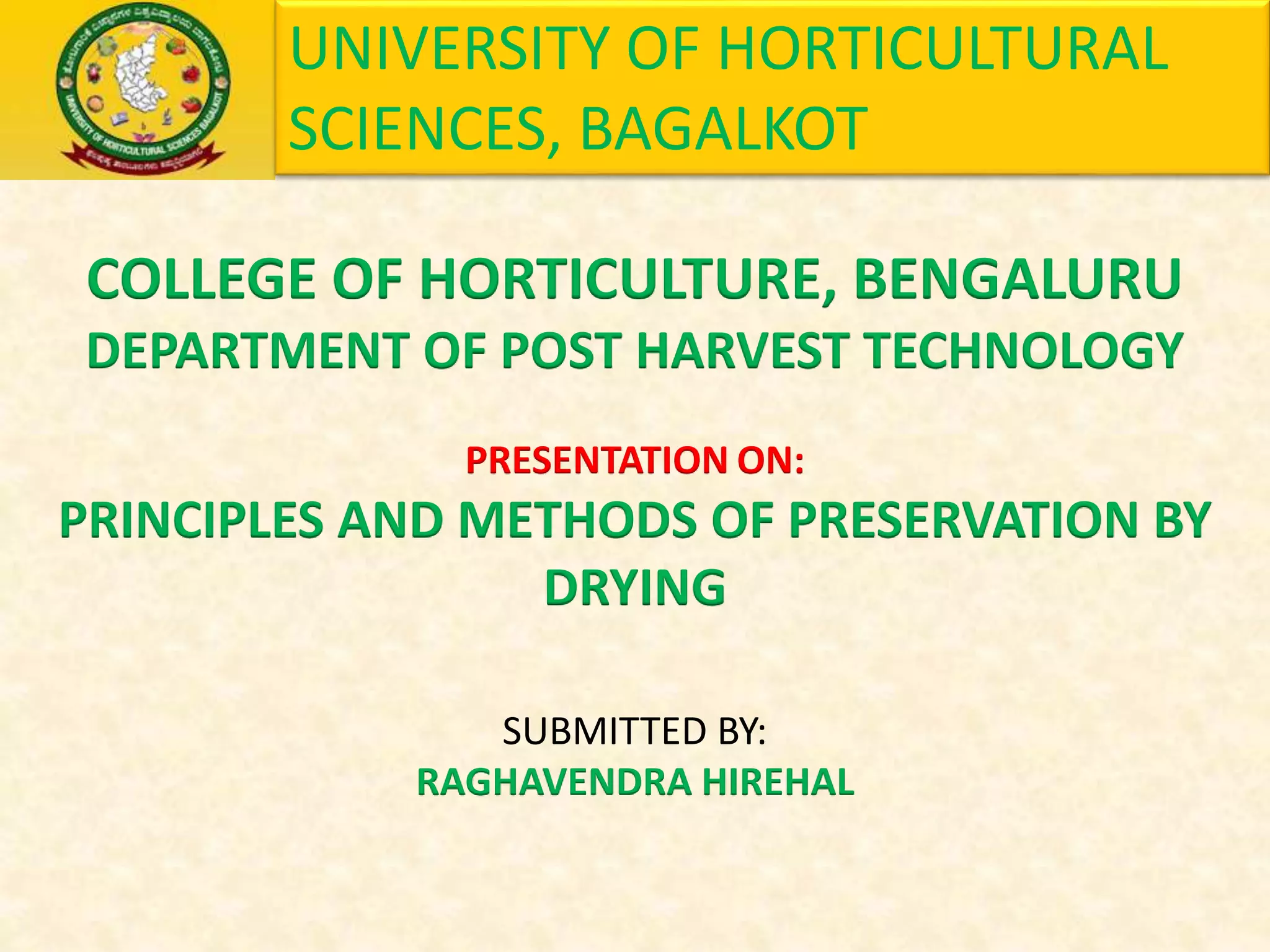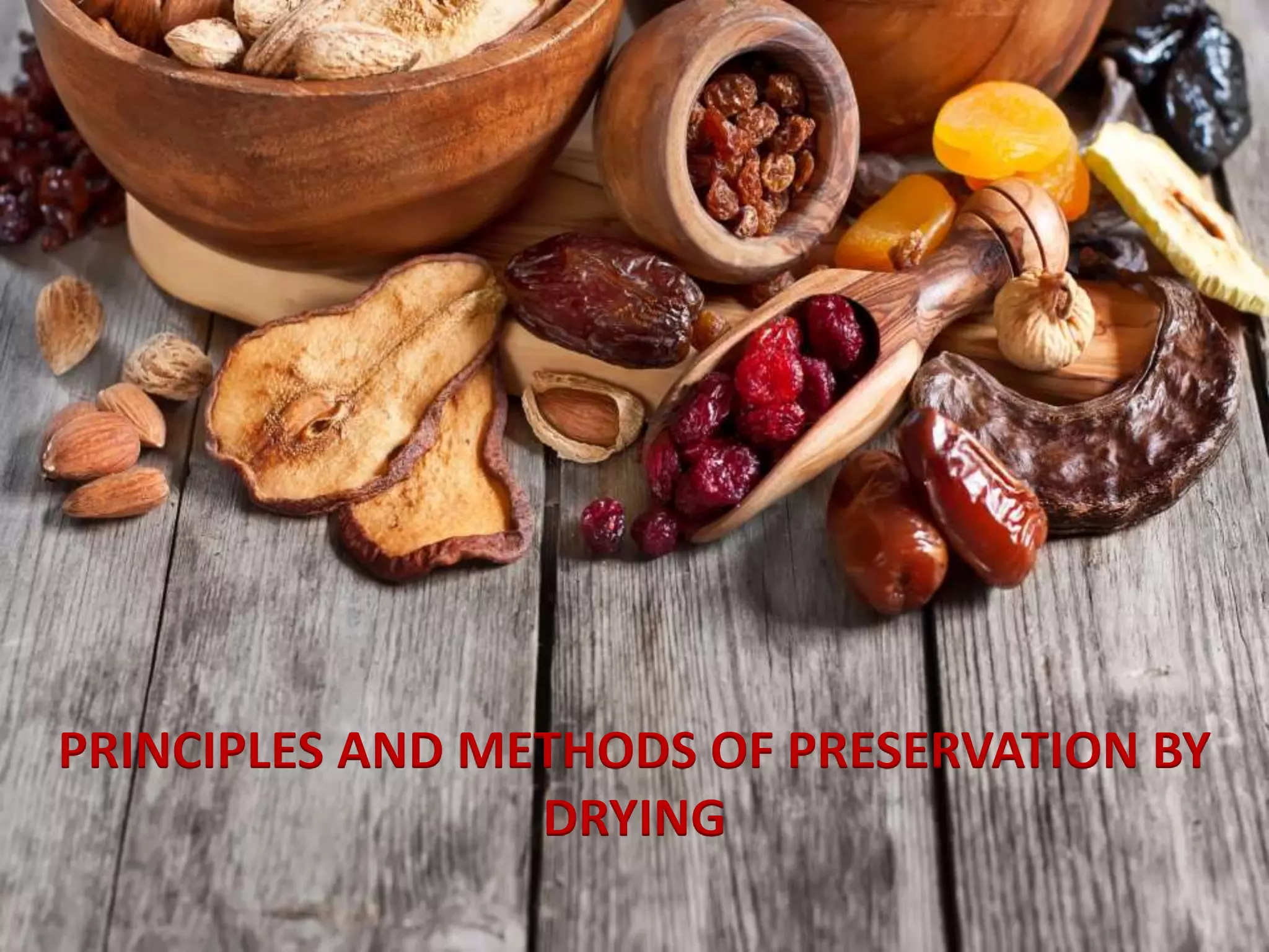 This document discusses principles and methods of preservation by drying. It begins by defining drying and dehydration as processes for removing water from food using non-conventional energy sources like sunlight and wind or under controlled conditions. The benefits of dried food include unlimited shelf life when properly stored, reduced transportation and storage costs, and portability. Various factors that affect drying rates and common types of drying methods are described. Pre-treatments like blanching and post-treatments like sweating and screening are outlined. Changes that occur during drying and determining dryness in fruits and vegetables are also summarized.