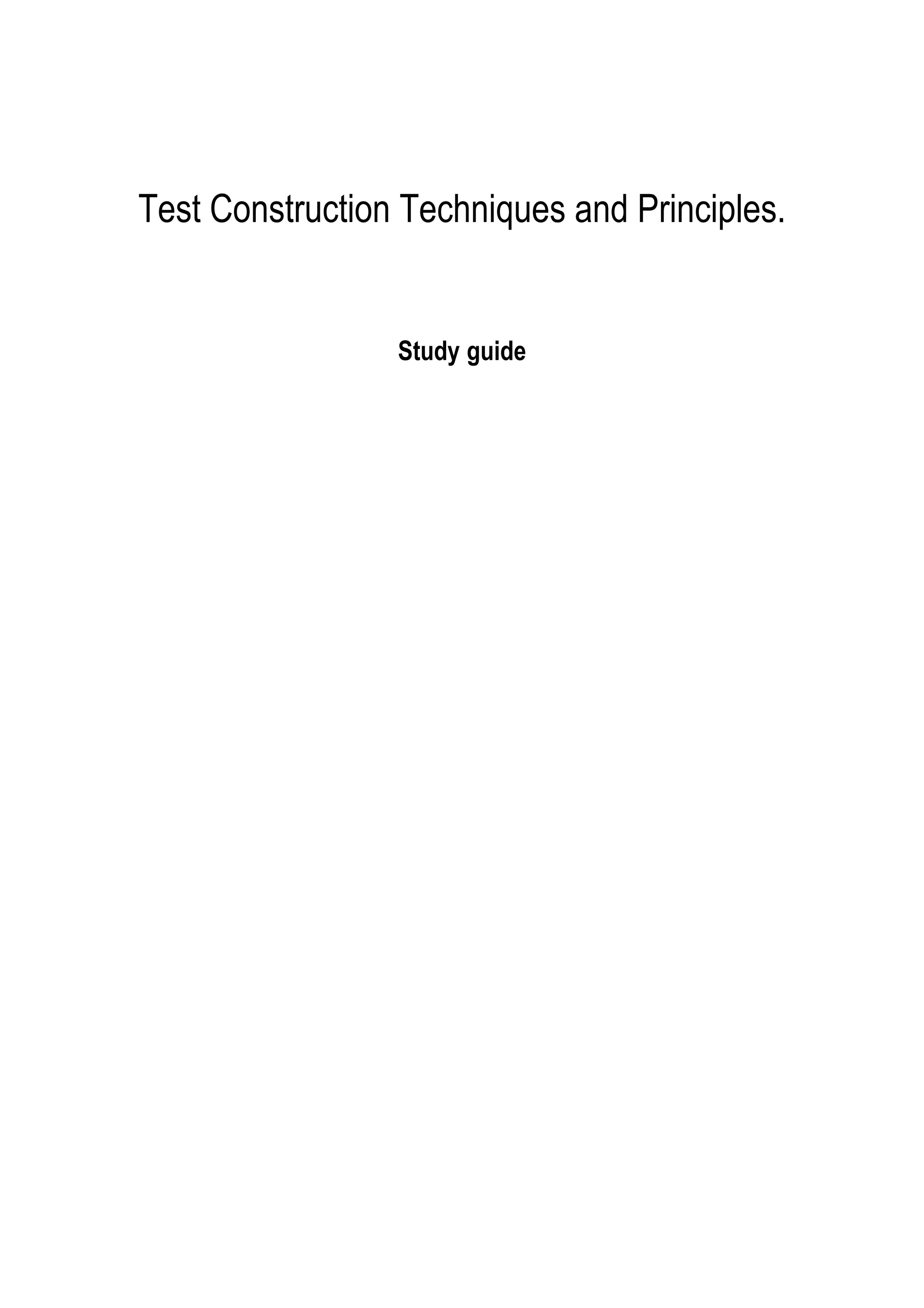 This document provides an overview and study guide for a course on test construction techniques and principles. The course consists of 10 modules that cover topics such as basic terms in educational evaluation, types of tests and classifications, characteristics of tests, test construction methodology, and test item development. The study guide outlines the tasks, activities, resources, and estimated time commitment for each module. It also describes the course's use of a socio-constructivist pedagogical approach and online learning management system platform. The overall goal is to teach skills relevant for educational assessment and evaluation across various fields of study.