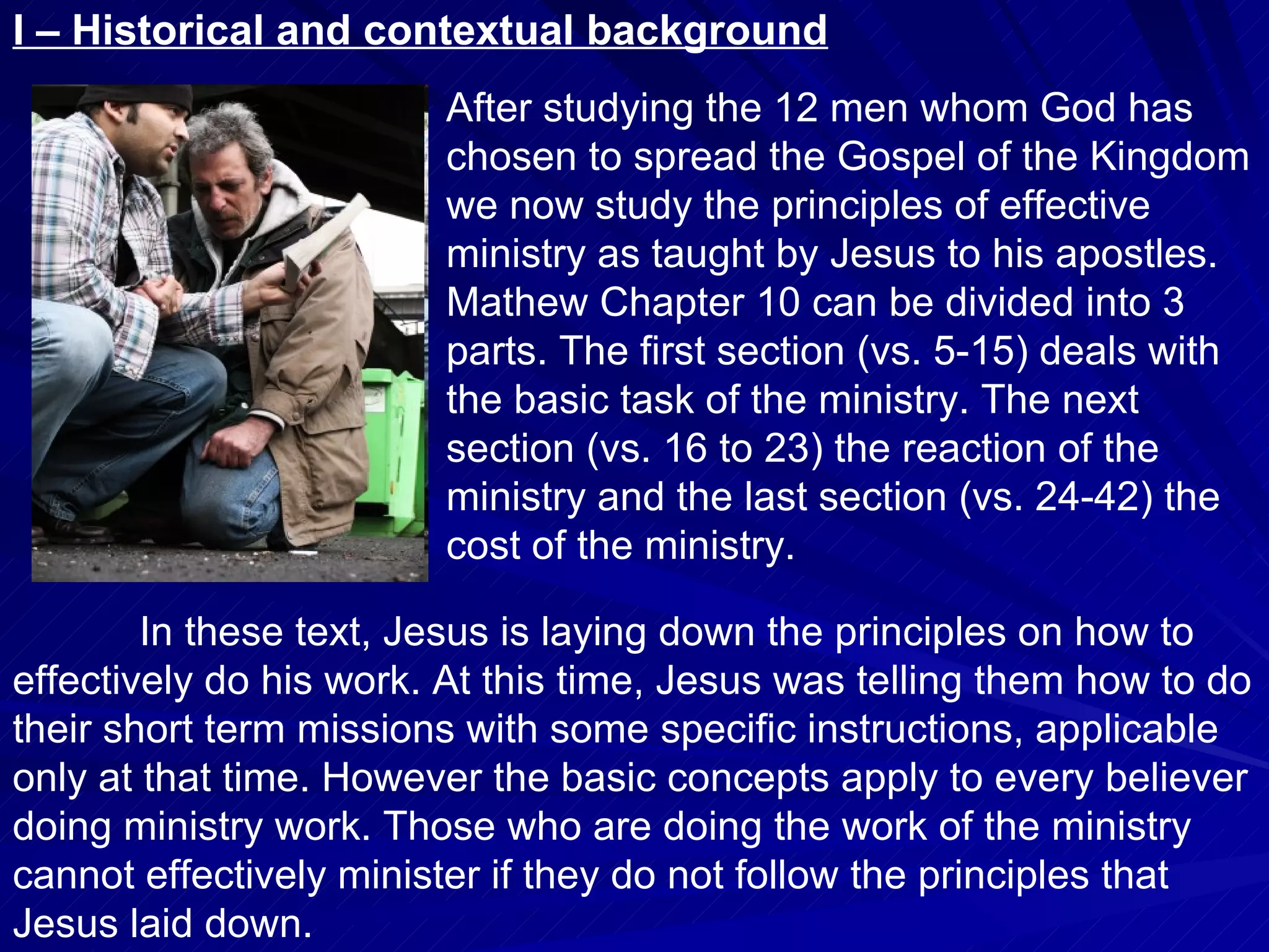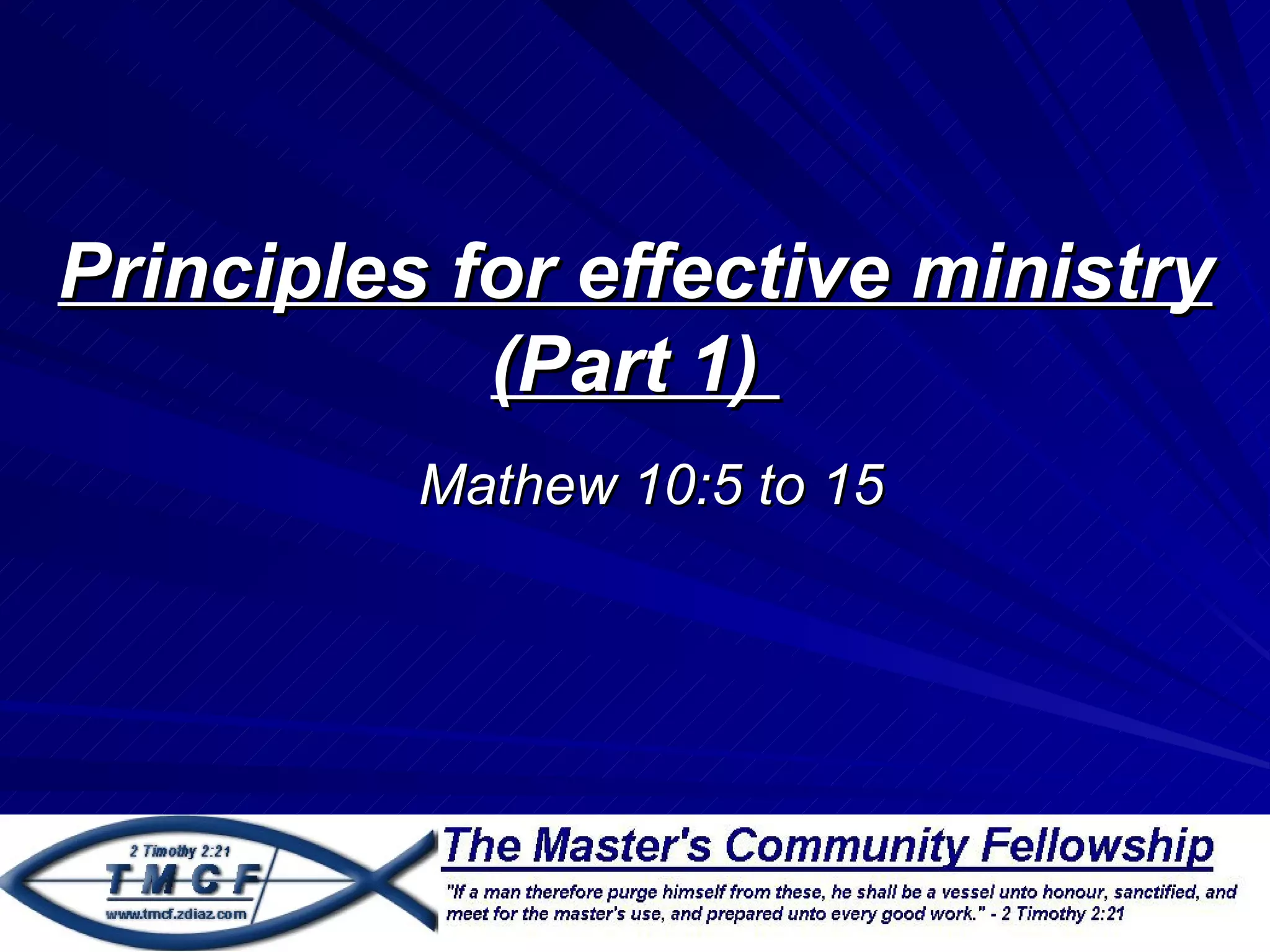 The document discusses principles for effective ministry based on Jesus' instructions to the apostles in Matthew 10:5-15. It outlines that disciples must (1) have a divine commission from God, (2) have a central objective or focus for their ministry work, and (3) understand the basic task of ministry is preaching the gospel. The passage specifically discusses how Jesus instructed the apostles to focus initially on the lost sheep of Israel, though the message was ultimately meant for all people.