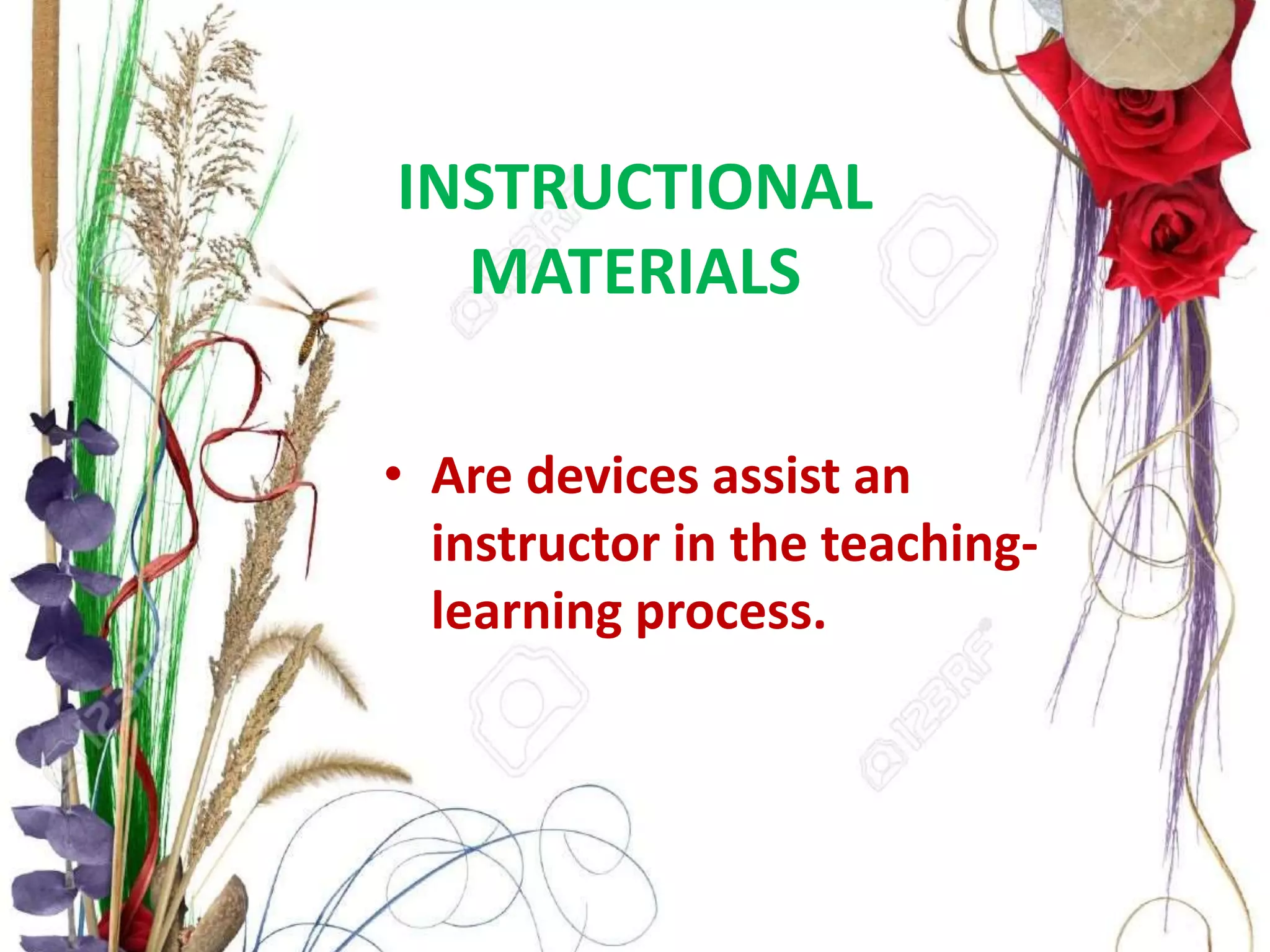 This document provides principles for selecting and preparing instructional materials for teaching. It recommends choosing materials that best suit the instructional objectives and using a variety if possible. When using materials, instructors should learn how to operate them, prepare introductory remarks, provide a conducive learning environment, explain objectives, and summarize after to reinforce learning. The selection of instructional materials should support lesson goals, engage students, build on prior knowledge, maintain interest, encourage participation, guide learning, and include proper sequencing, understandability, and safety precautions.