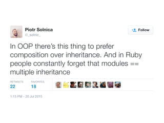 The document discusses software development principles, notably within the context of Ruby on Rails, emphasizing concepts like DRY (Don't Repeat Yourself), KISS (Keep It Simple, Stupid), and YAGNI (You Aren't Gonna Need It). It critiques the common misapplication of these principles, suggesting that Rails can create complex problems rather than simplify them, and encourages developers to rethink traditional MVC structures. The author advocates for principles like composition over inheritance and suggests exploring alternative architectural paradigms.