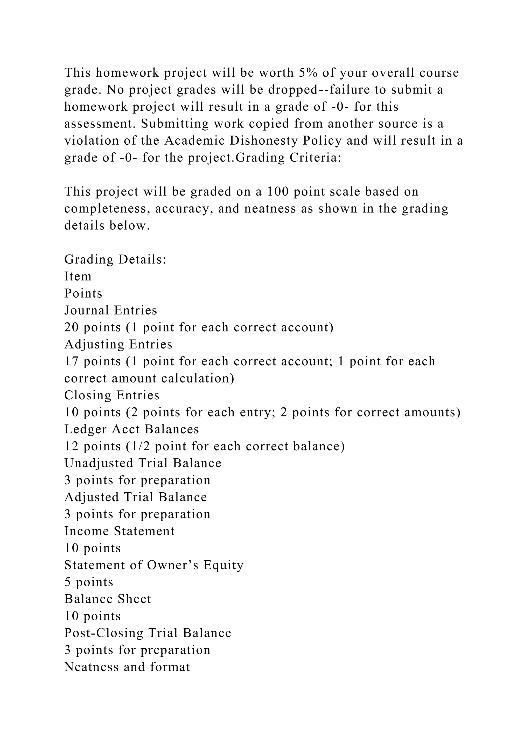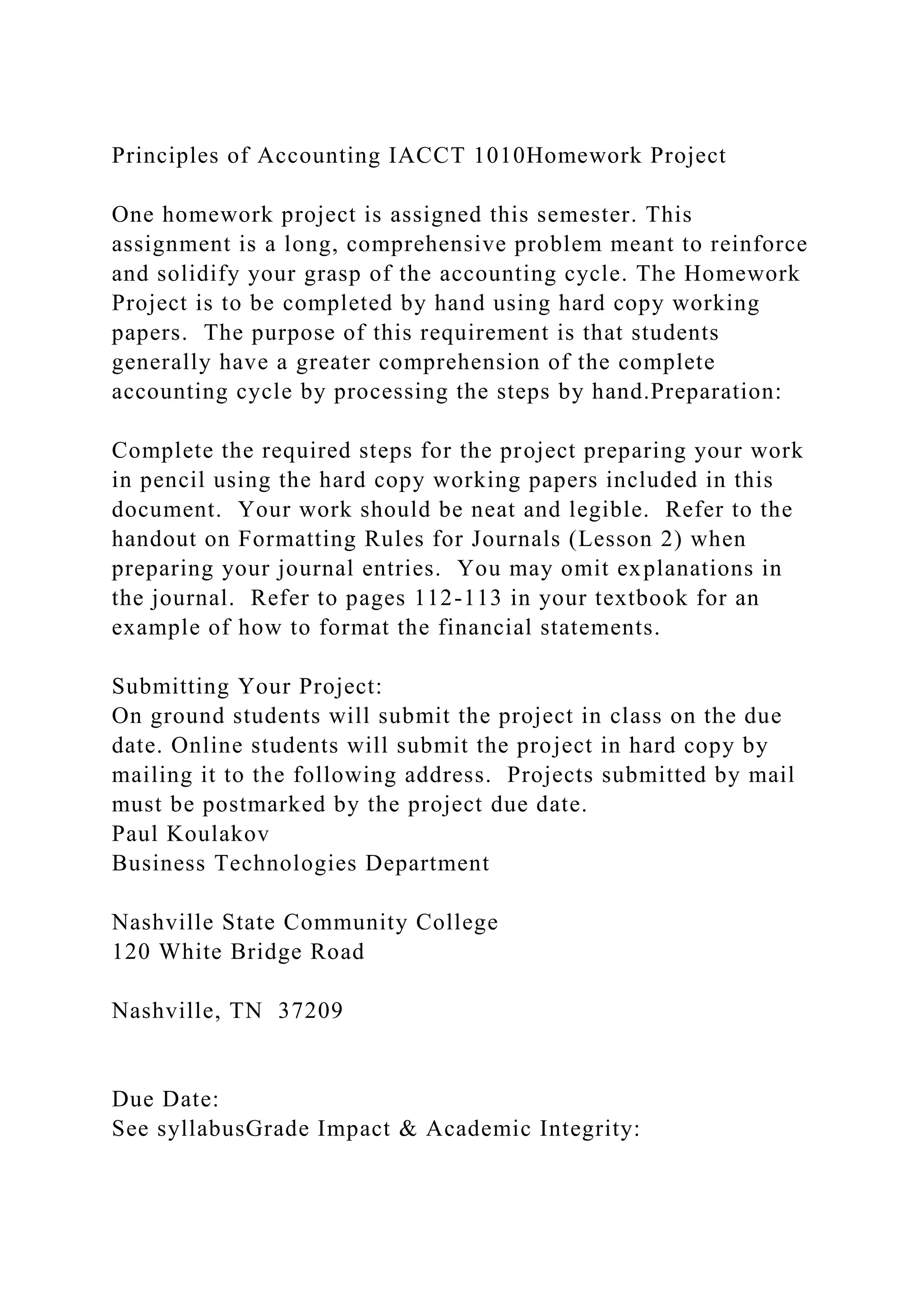 The document outlines a homework project for an accounting course, specifically IACCT 1010, focusing on completing the accounting cycle through detailed steps such as journalizing transactions and preparing financial statements by hand. It emphasizes the importance of neatness, accuracy, and adherence to format, with a grading structure of 100 points based on various components of the project. Additionally, the project includes specific transactions for a consulting firm, Jamison Consulting, and requires students to perform tasks such as adjusting entries and creating a trial balance.
