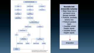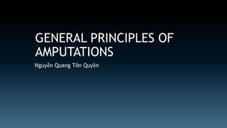 The document discusses the history and principles of amputations. It covers indications for amputations including peripheral vascular disease, trauma, infections and tumors. Key points include determining the appropriate amputation level by balancing function versus complications, and employing techniques like rigid dressings and early prosthesis to aid healing and rehabilitation. The goal of amputation is to remove non-viable tissue while preserving maximum function through prosthetics.