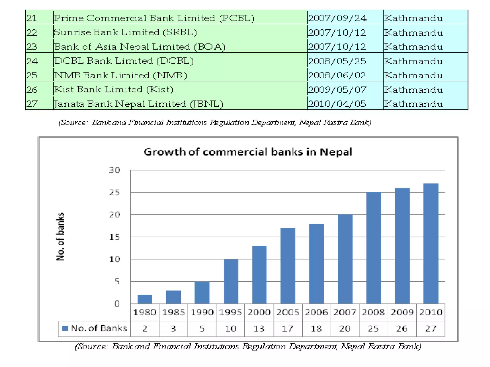 The document provides an overview of the banking and insurance sectors in Nepal. It states that Nepal Rastra Bank governs banking and Insurance Board of Nepal governs insurance. There are 6 types of financial institutions in Nepal, with commercial banks, development banks, and finance companies being most popular. There are 25 insurance companies total - 8 life insurance companies, 16 non-life insurance companies, and 1 life and non-life insurance company. Lists of commercial banks and the different types of insurance companies in Nepal are also included.