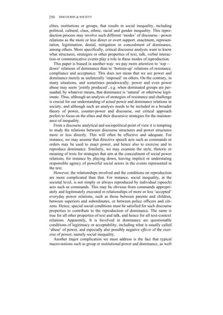 This document discusses principles of critical discourse analysis (CDA). CDA aims to analyze how power and dominance are enacted and reproduced through discourse. It focuses on how elite groups and institutions maintain dominance and social inequality through patterns of access to public discourse. CDA takes an explicit sociopolitical stance and focuses on the perspectives of dominated groups. It examines how social cognition and representations in people's minds provide the link between discourse and the reproduction of dominance at the societal level.