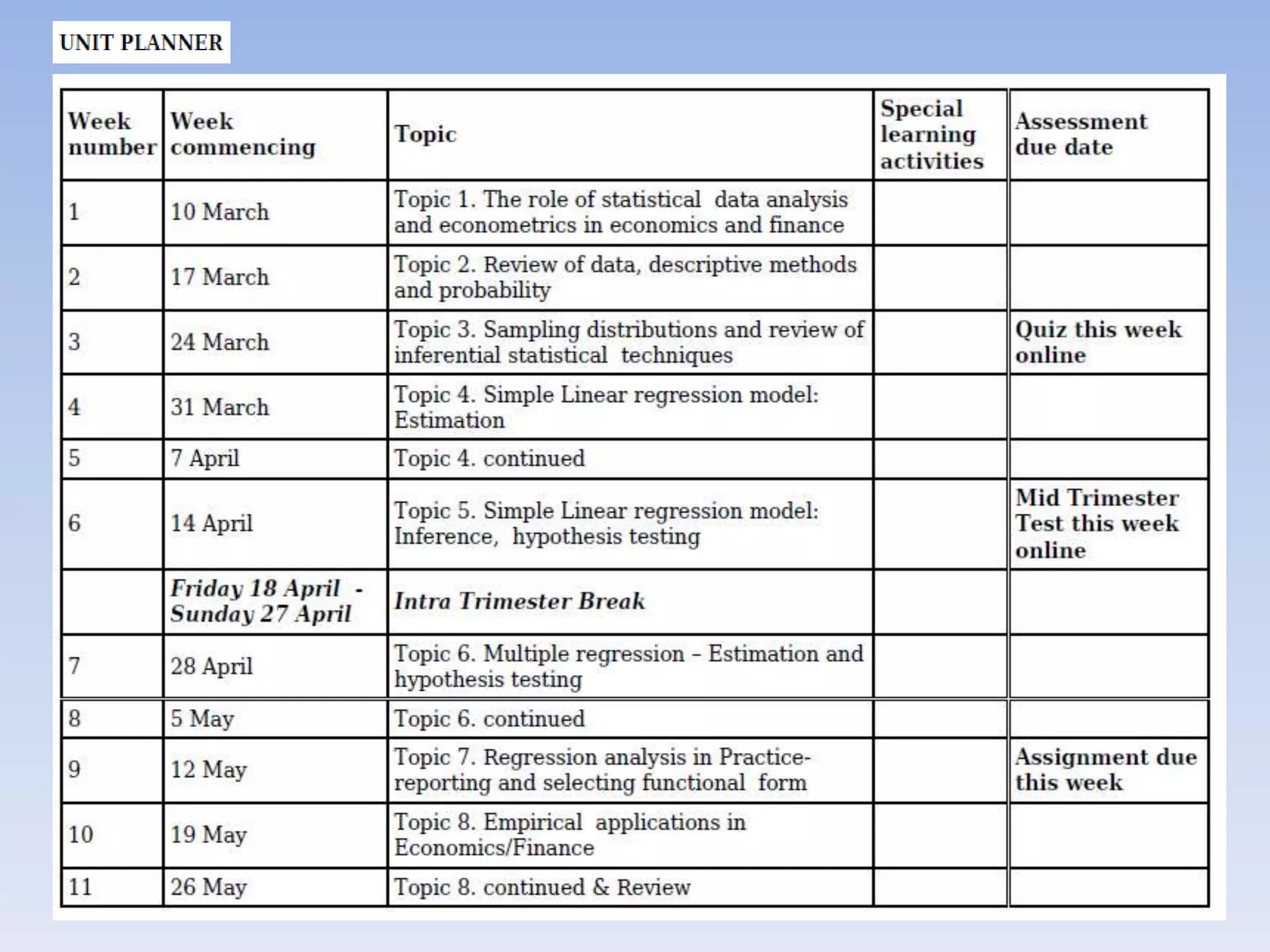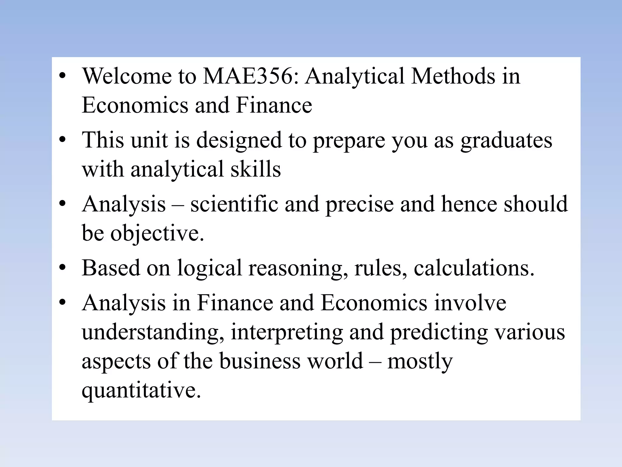 This document provides an overview of an analytical methods course for economics and finance. It introduces the course staff and coordinators. It describes how econometrics can be used to answer quantitative questions about economics and business. It also discusses different types of economic data and some basic mathematical and statistical concepts needed for the course, including summation, probability, and random variables. An important note reminds students about class attendance, staff consultation hours, accessing learning materials, and preparing for an upcoming online quiz.
