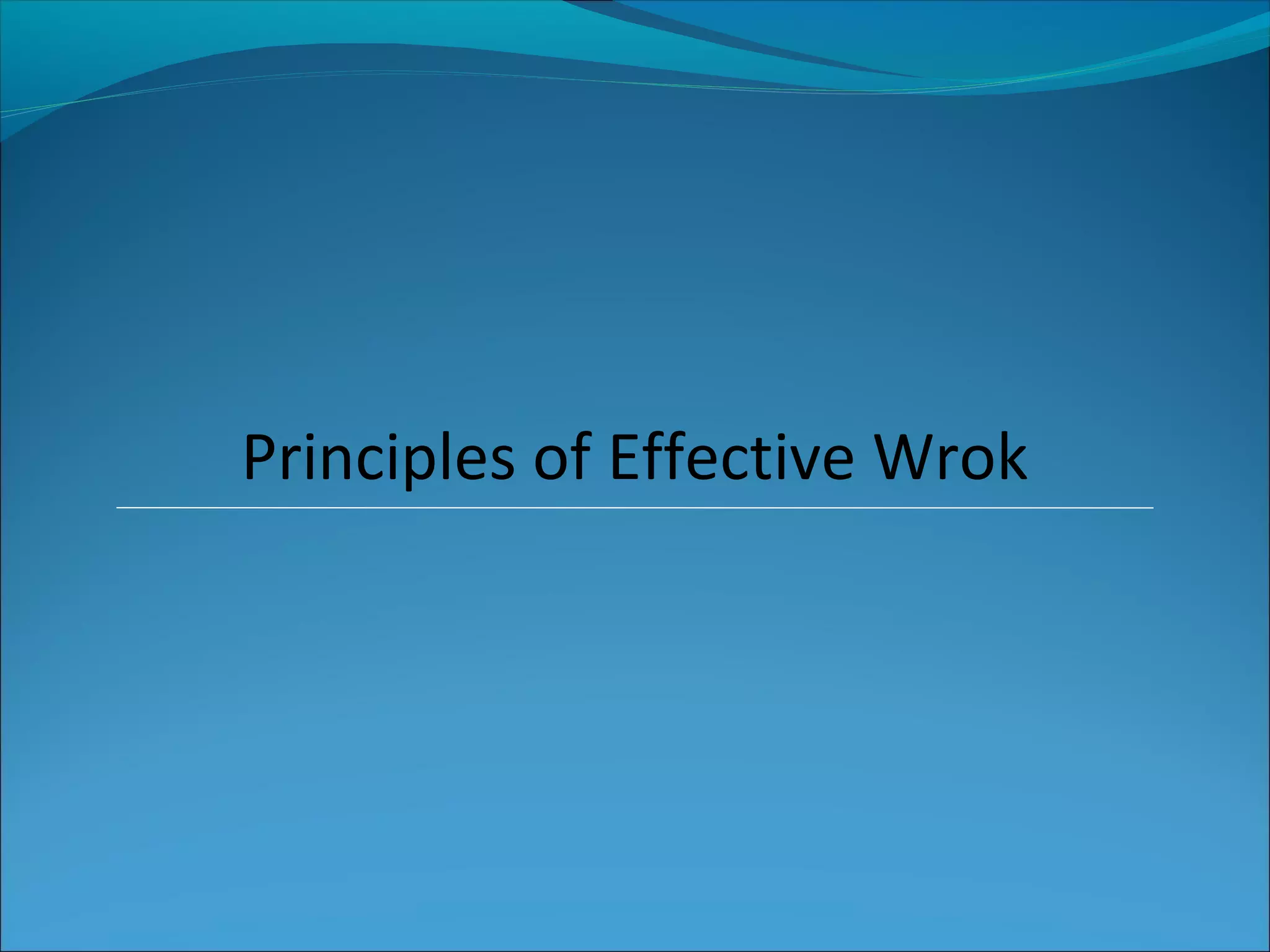 The document outlines principles of effective work, including being focused on direction, taking responsibility, thorough preparation, prioritizing high-value tasks, making decisive commitments to action, persistence through challenges, excellence in key areas, maintaining strong relationships, and providing high-quality service. Following these principles leads to greater accomplishment, appreciation, and career advancement. Effective performance relies on disciplined application of time and effort to the most important goals.