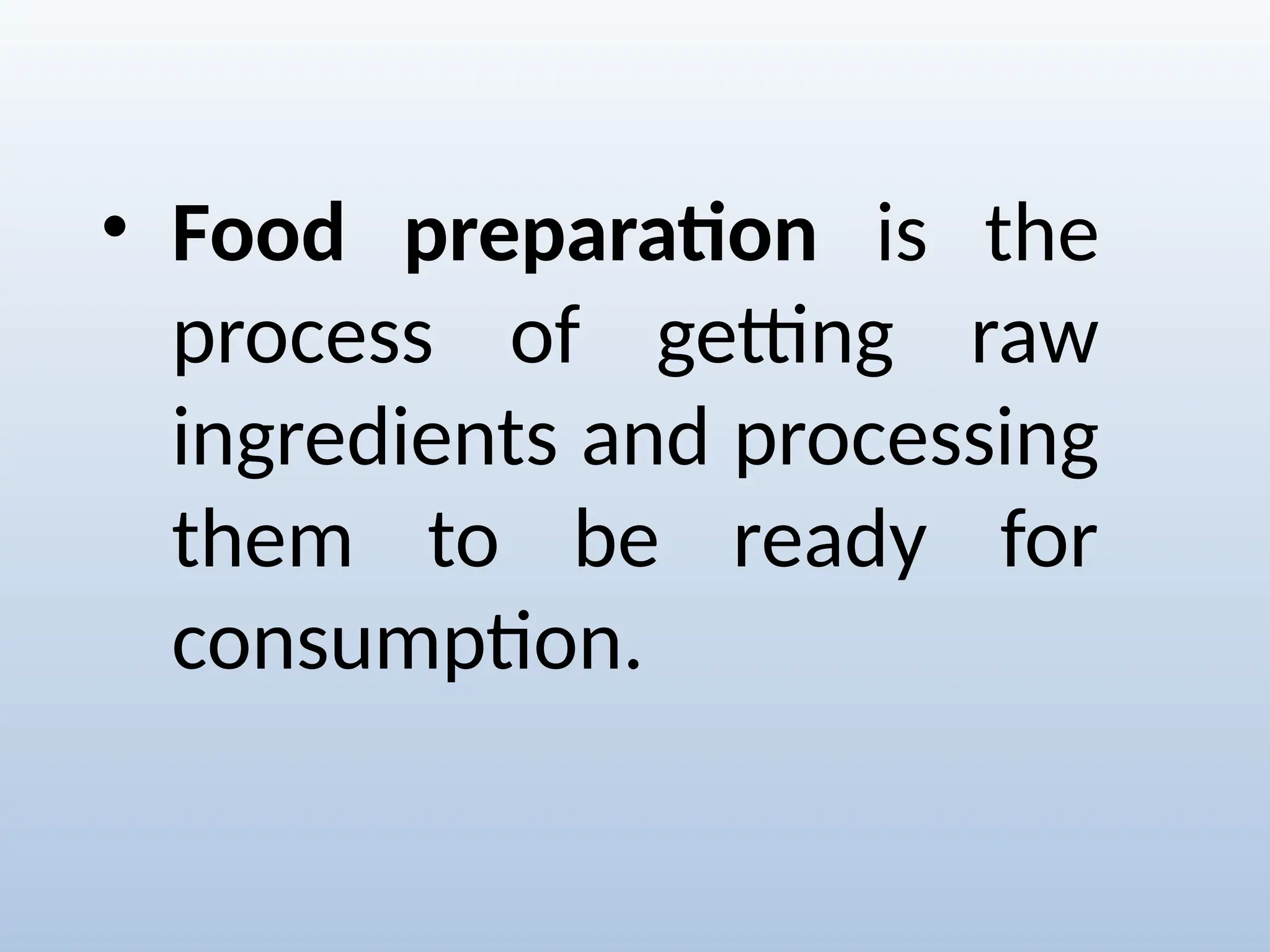 Food preparation involves processing raw ingredients for consumption while adhering to principles for safety and hygiene. Key guidelines include choosing durable foods, cooking meat thoroughly, avoiding cross-contamination, and maintaining cleanliness in the kitchen. Proper storage and use of safe water for washing are also emphasized.
