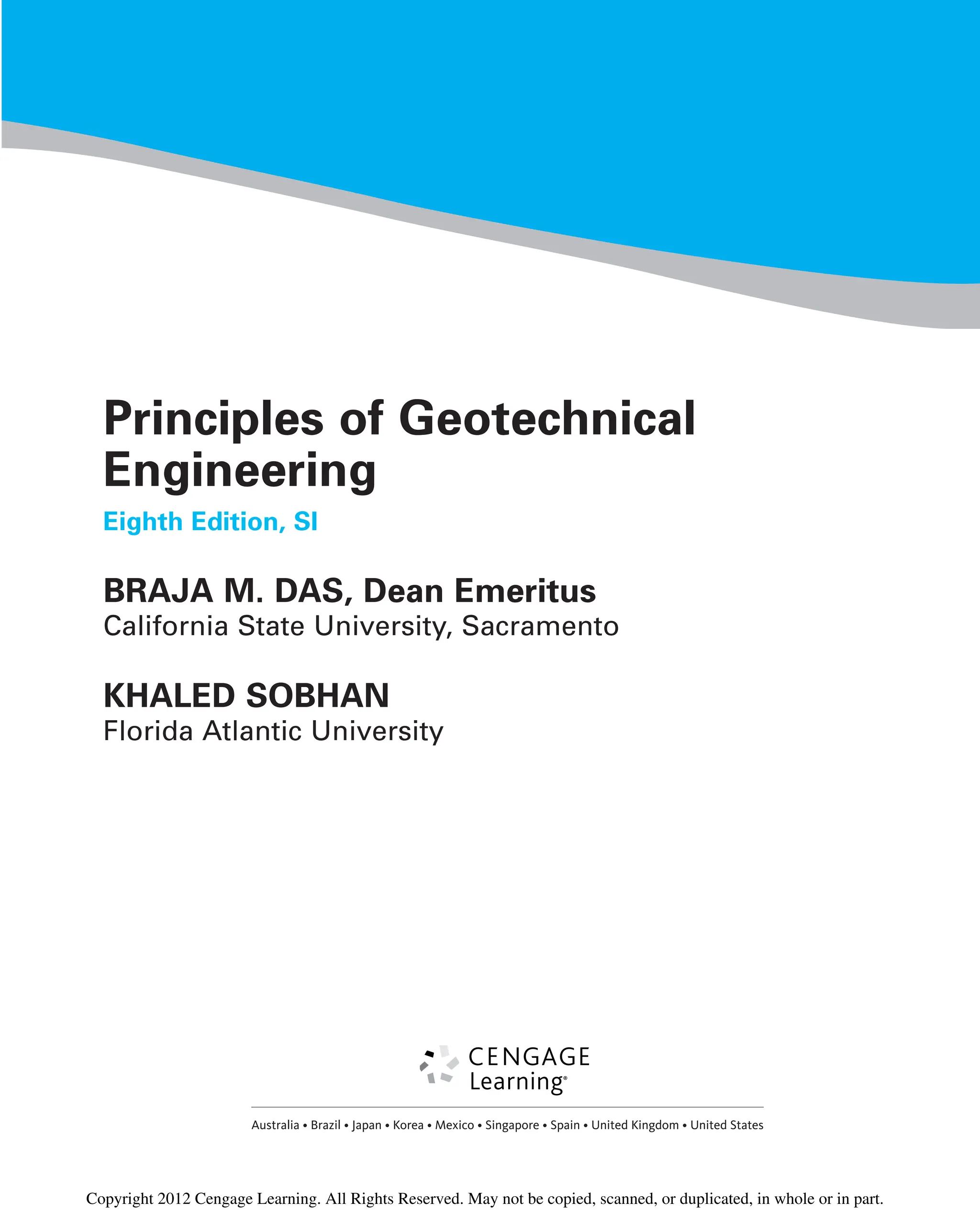 The document provides an overview of the principles of geotechnical engineering. It begins with a historical perspective on the development of the field from ancient times through the modern era. It then covers various topics related to soil properties including the origin and formation of soils, particle size and shape, clay minerals, specific gravity, mechanical analysis, particle size distribution, weight-volume relationships, void ratio, porosity, moisture content, unit weights, and relative density. The text is intended as a textbook for introductory geotechnical engineering courses.