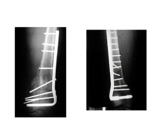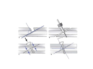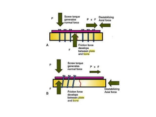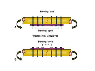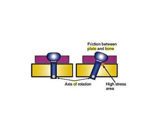This document discusses the principles of internal fracture fixation according to the AO foundation. It covers the historical background of internal fixation techniques dating back to the late 19th century pioneers. The key principles of internal fixation are outlined as anatomical reduction, stable fixation, preservation of blood supply, and early mobilization. Various internal fixation devices, techniques, and their functions are described in detail including plates, screws, intramedullary nails. Factors such as fracture pattern, bone quality, and soft tissue injury that influence the choice of implants are also discussed.