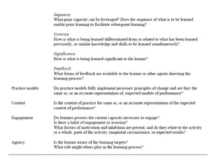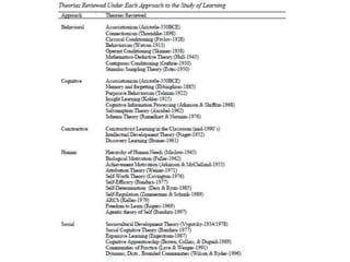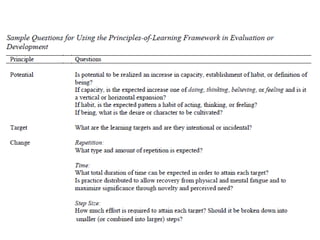 The document discusses the principles of learning as articulated by Dr. Christian Weibell, emphasizing the relationships between variables in learning methods and the shift toward principle-based approaches in education. It outlines multiple theories and approaches to studying learning, including behavioral, cognitive, constructive, human, and social perspectives, while also identifying ten key principles relevant to effective learning. The text advocates for the application of these principles in practical settings, aiming to enhance the development and evaluation of instructional products and methods.