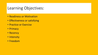 Dr. N. ANANDAKUMAR discusses 7 principles of learning: 1) Readiness or motivation refers to a learner's willingness and eagerness to learn something new through attention, interest and curiosity. 2) Effectiveness or satisfying means learning is strengthened when accompanied by a pleasant or satisfying feeling like satisfaction. 3) Practice or exercise means that concepts repeated most often are best remembered through use and disuse. 4) Primacy refers to how things learned first often create strong impressions that are difficult to change, like first impressions. 5) Recency means things learned most recently are best remembered, like recent events. 6) Intensity refers to learning more from intense, real experiences than substitutes, like from movies.