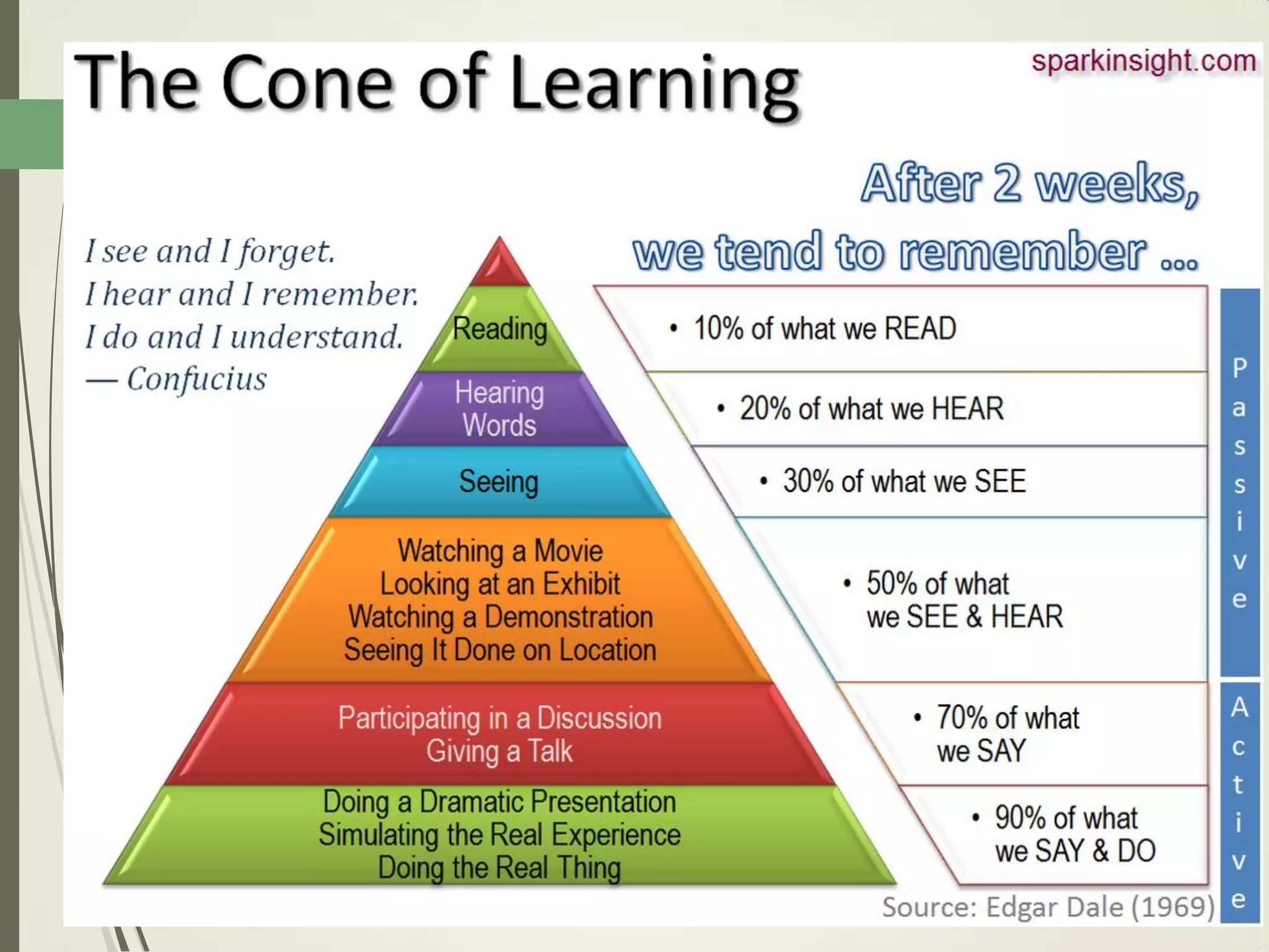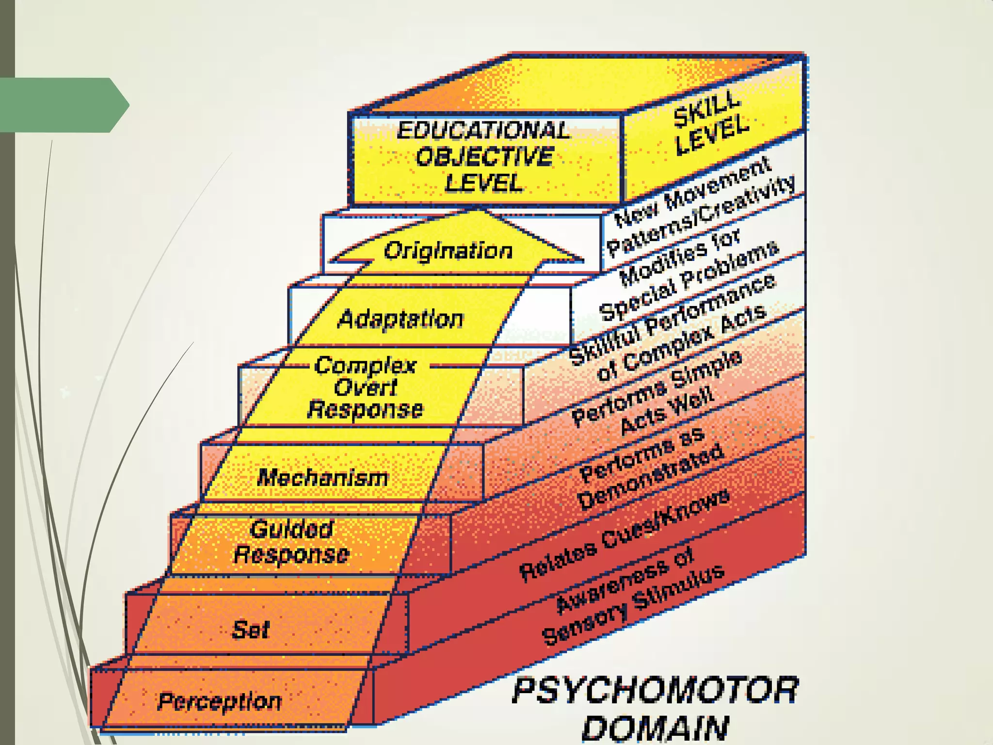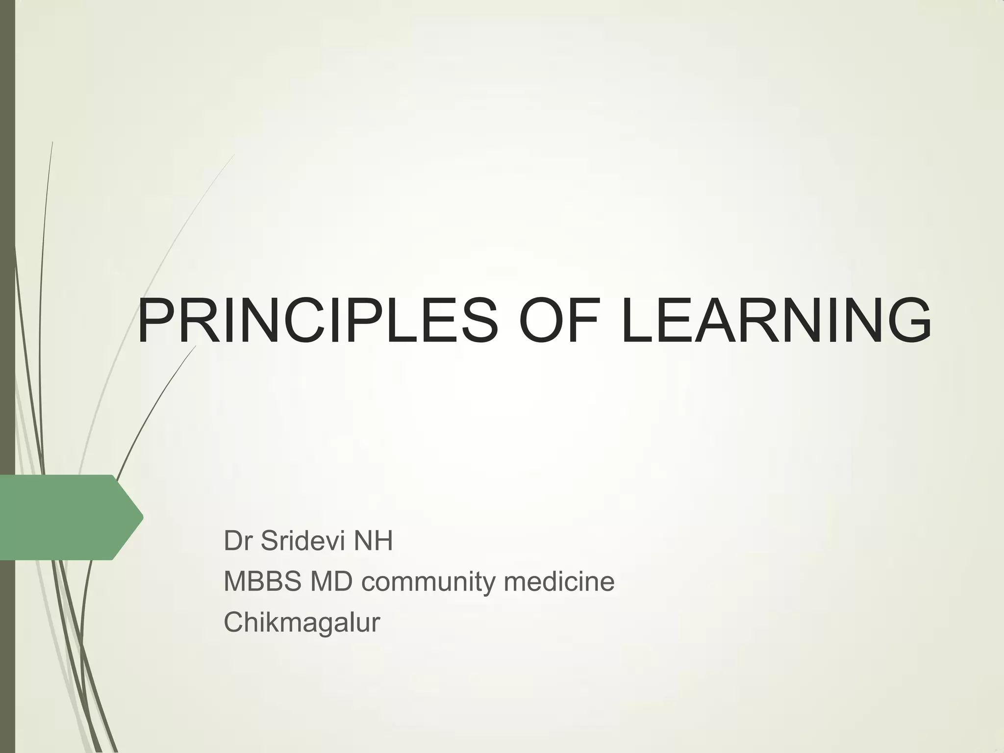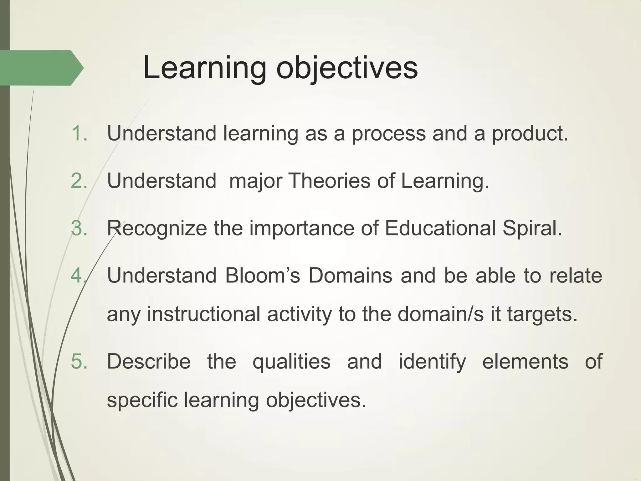 This document outlines principles of learning, including learning theories such as behaviorism, cognitivism, humanism, constructivism, and social learning theory. It discusses Bloom's domains of learning, including cognitive, psychomotor, and affective domains. The educational spiral and components of specific learning objectives are also explained. The overall goal is to understand learning as a process and product, major learning theories, the importance of the educational spiral, how to relate instructional activities to Bloom's domains, and describe qualities and elements of specific learning objectives.