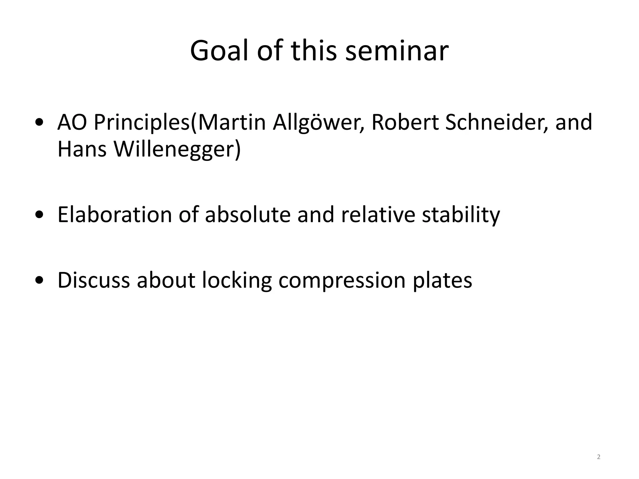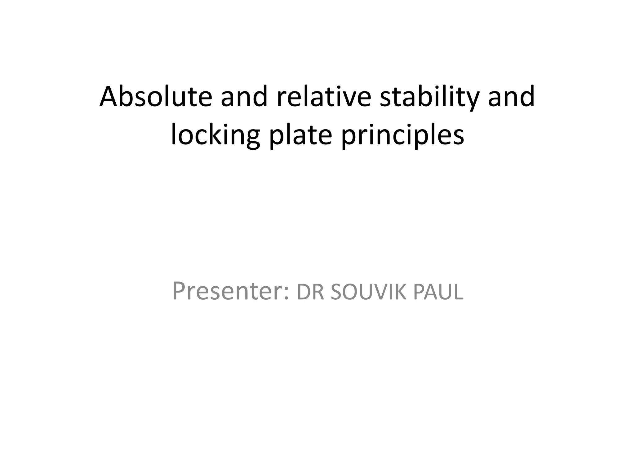 This document discusses the principles of absolute and relative stability in fracture fixation, as well as locking compression plates. It describes how absolute stability aims to reduce strain below a critical level for primary healing without callus formation, while relative stability allows some motion and secondary bone healing through callus formation. Locking compression plates provide angular stability through locking head screws in the plate and bone, maintaining blood supply while providing fixation. They can be used for compression of reduced fractures or for splinting in multifragmentary fractures.