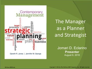 This document discusses planning and strategy for organizations. It defines planning as identifying goals and courses of action, while strategy is deciding on goals, actions, and resource allocation. There are different levels and time horizons for plans, from short-term operational plans to long-term strategic plans. Scenario planning involves generating forecasts of future conditions and responses. Strategies are formulated through analyzing strengths, weaknesses, opportunities, and threats via SWOT analysis. Porter's five competitive forces model also informs strategy by assessing rivalry, potential entry, supplier and customer power, and substitutes.