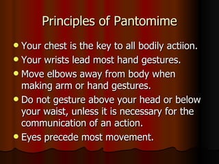 The art of pantomime uses the body to communicate without words. The chest and wrists are key to gestures while keeping arm movements below the head and waist. Eyes typically precede movement and opposite actions emphasize it. Positive emotions expand the body through broad gestures while negative emotions contract it with restricted movement. Faces must remain visible and all actions require clear motivation from the story.
