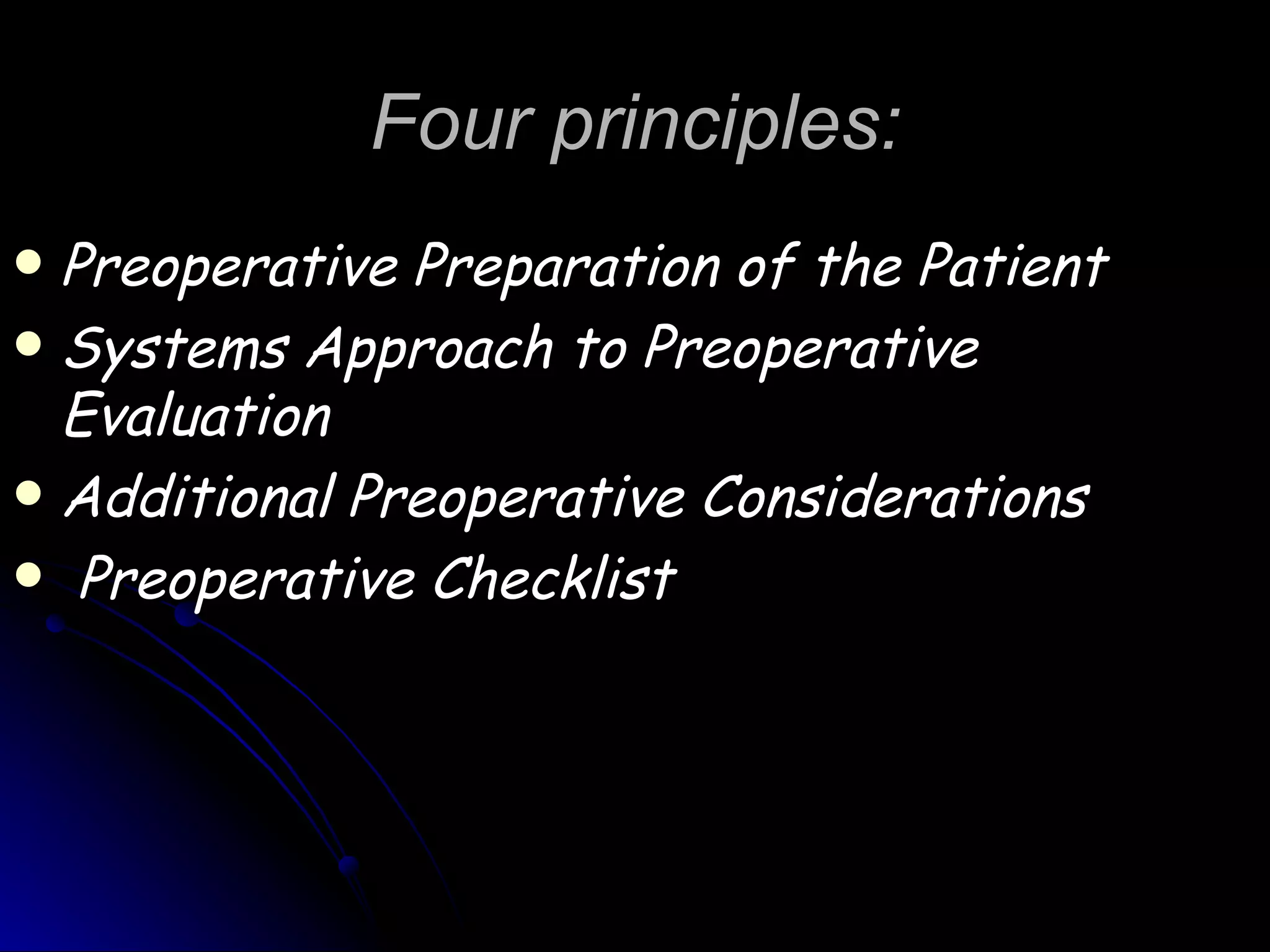 This document discusses principles of preoperative and operative surgery. It covers four main principles: preoperative preparation of the patient, a systems approach to preoperative evaluation, additional preoperative considerations, and a preoperative checklist. For preoperative evaluation and preparation, the document emphasizes assessing patient risk factors, especially cardiovascular risk, and optimizing high-risk patients prior to surgery through testing, medication, and consultation with specialists. The goal is to identify any medical issues that could impact the surgical outcome and take steps to improve the patient's status and reduce perioperative risk.