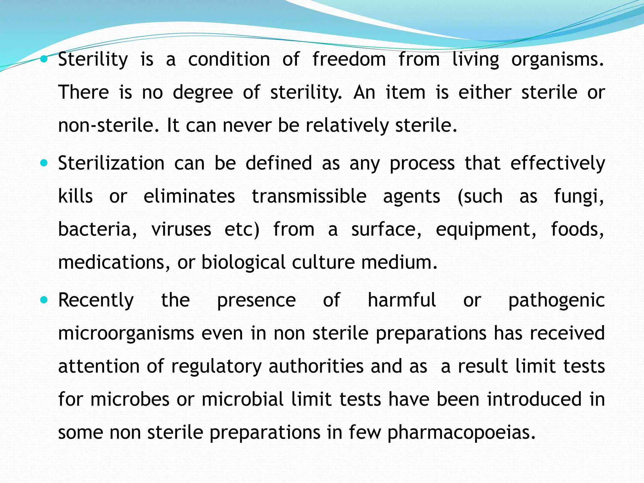 Sterilization refers to any process that eliminates transmissible agents like bacteria, viruses, and fungi. There are several methods of sterilization, including heat, radiation, filtration, and chemicals. Heat sterilization is the most common method and involves the use of dry heat or moist heat to kill microorganisms. Moist heat in the form of steam under pressure, as used in an autoclave, is effective at penetrating materials and achieving sterilization. Other methods include radiation like UV light or gamma rays, filtration through fine filters to physically remove microbes, and chemicals like ethylene oxide gas that sterilize without heat.