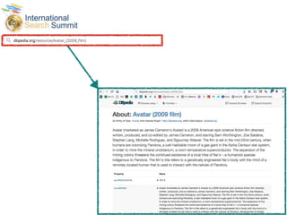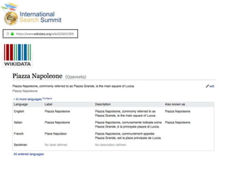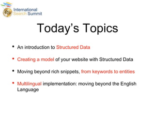The document discusses structured data principles for multilingual websites, emphasizing the importance of creating a model to organize website content clearly and reduce ambiguity. It highlights the transition from keywords to entities, the role of structured data in providing unambiguous signals, and outlines practical steps for implementation. Additionally, it introduces DBpedia as a resource for extracting structured information from Wikipedia to enhance data processing.