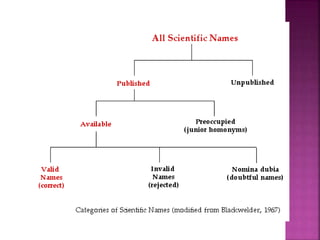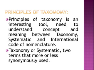 The document discusses taxonomy and systematics. It defines taxonomy as the science of classifying organisms and systematics as including taxonomy along with theoretical and practical aspects of evolution. The key points are:
