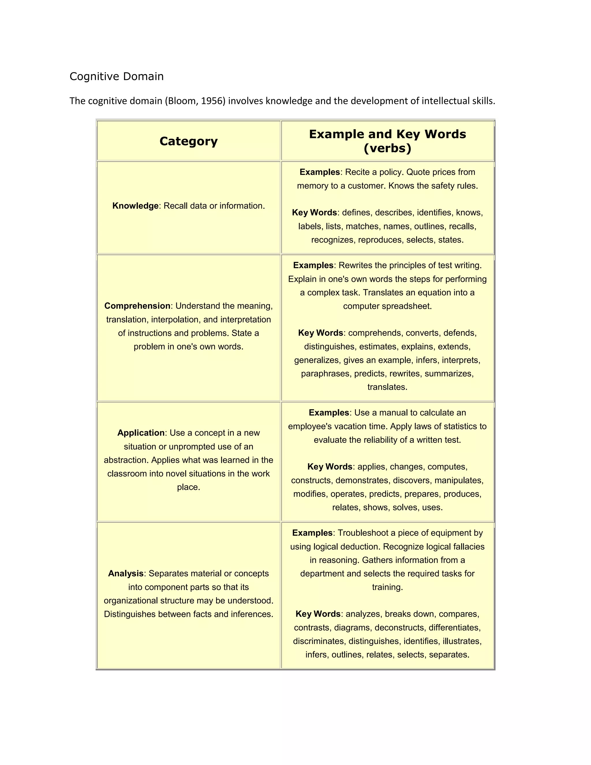 The cognitive domain involves the development of intellectual skills like knowledge, comprehension, application, analysis, synthesis, and evaluation. The affective domain includes how people deal with things emotionally and includes constructs like receiving phenomena, responding to phenomena, and valuing. Both domains describe classifications of learning objectives and outcomes.