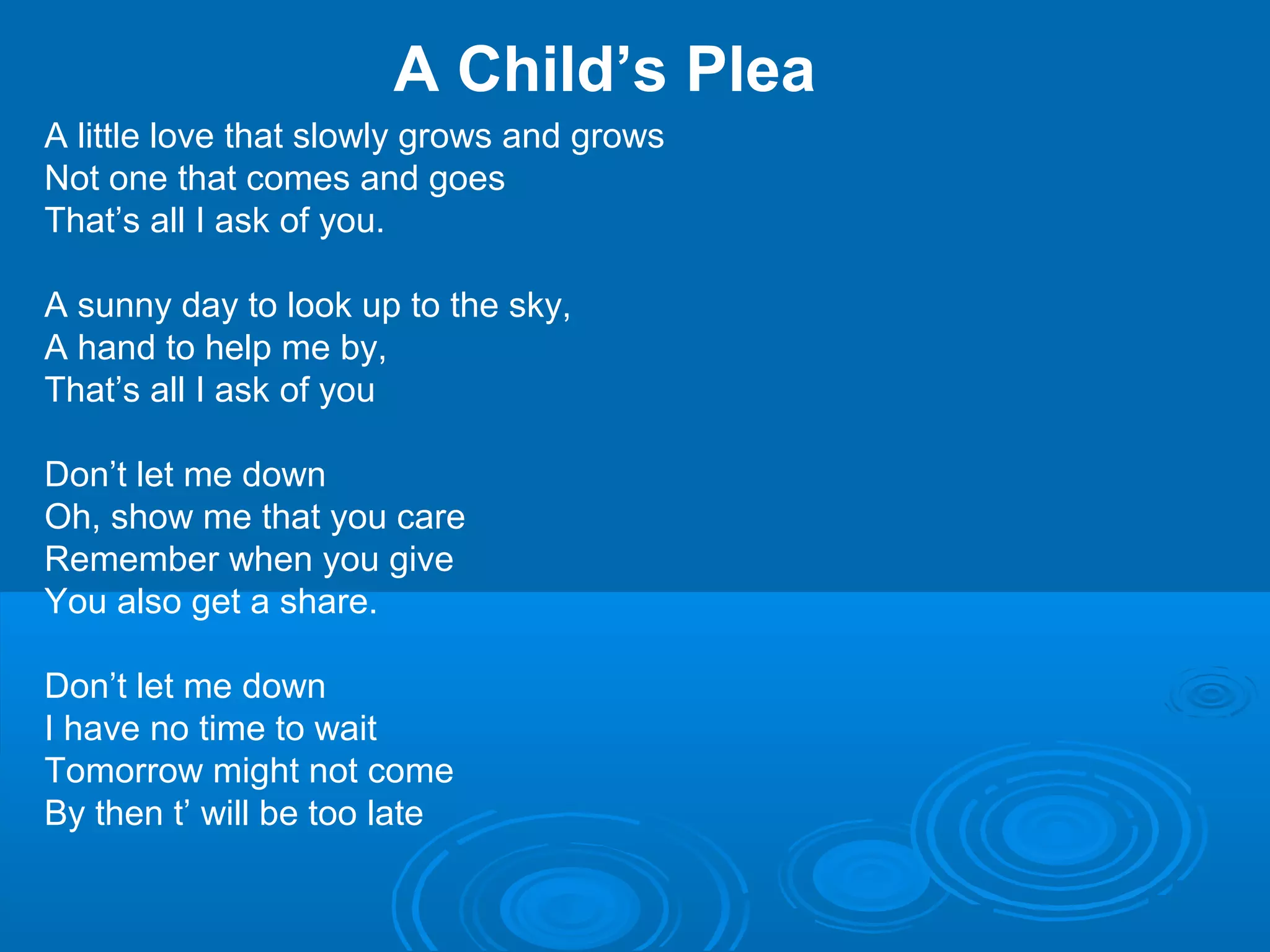 The poem expresses a child's plea for love, care, and support from a caregiver. The child asks for a love that lasts, not one that comes and goes, as well as a sunny day to enjoy and a helping hand. The child worries about being let down and asks the caregiver to show they care through their actions. The child has no time to wait, implying tomorrow is uncertain.