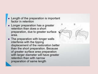 The document discusses principles of tooth preparation for fixed partial dentures. It covers objectives like reducing tooth structure for retention while preserving healthy tooth structure. Principles include conservative preparation with minimal taper and preservation of tooth structure. Margin placement should be supragingival when possible. Margin designs like chamfer and shoulder are described. Tooth preparation creates retention and resistance for fixed restorations.