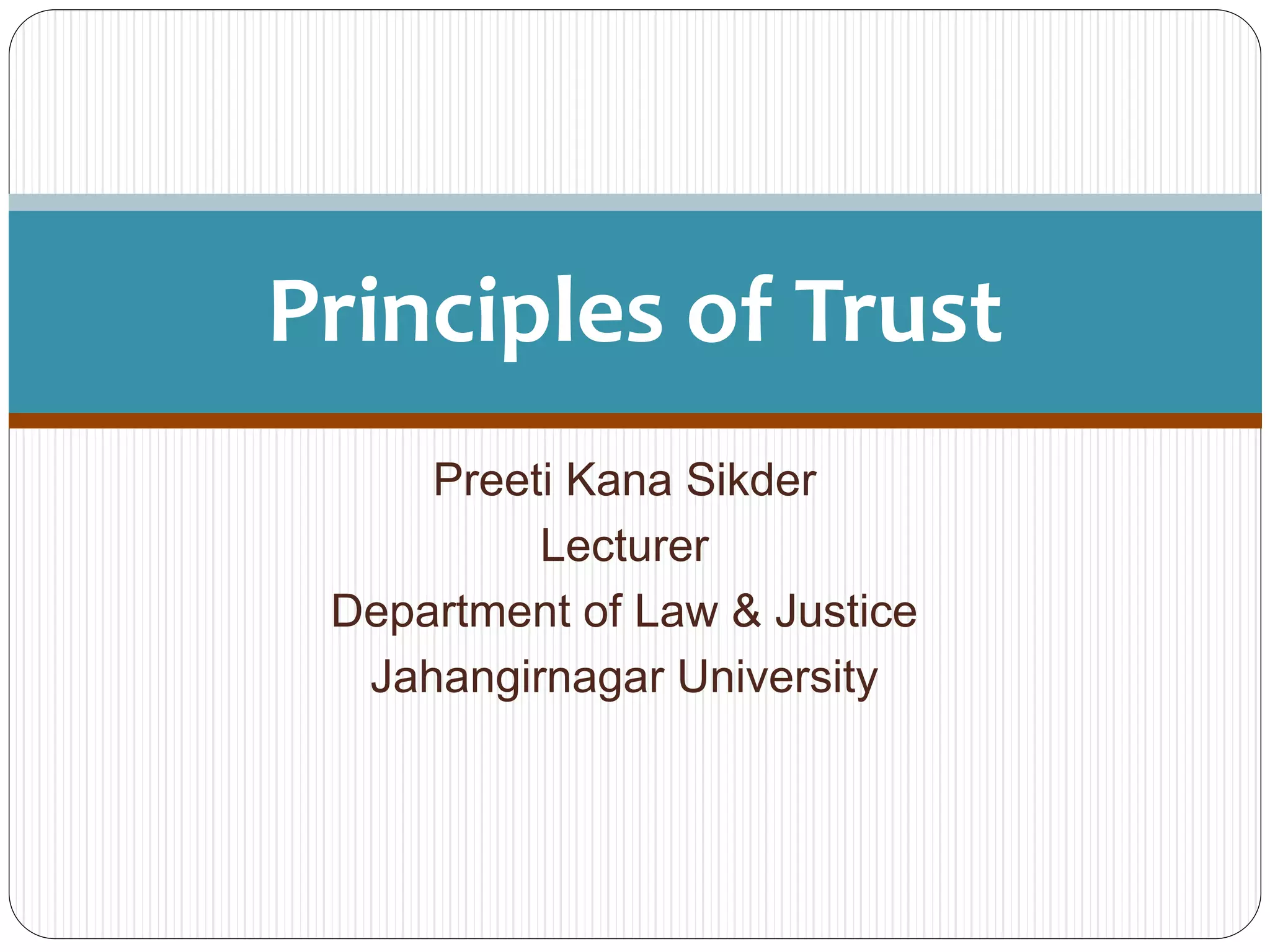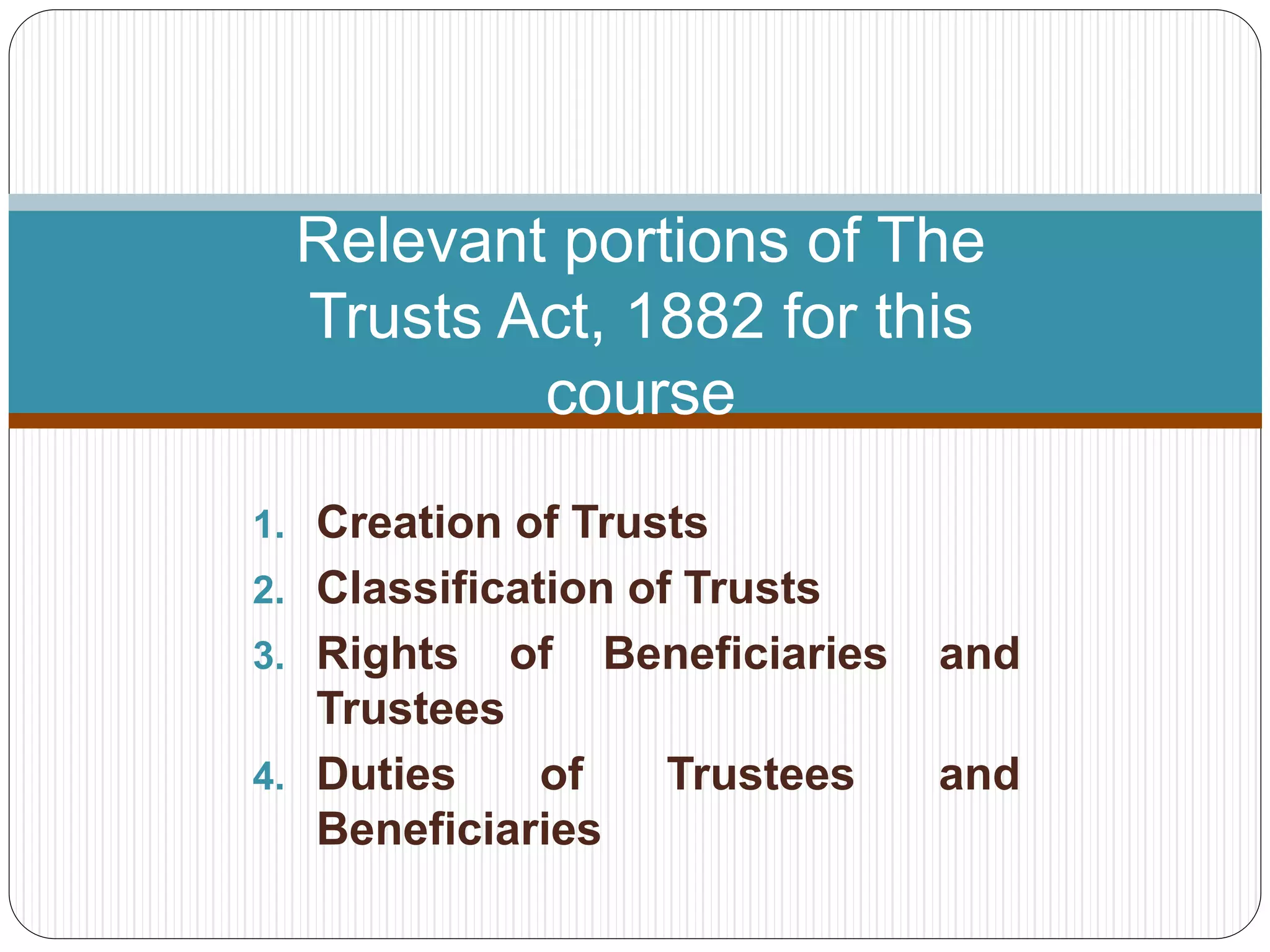 The document outlines the principles of trust law, particularly focusing on the classification, rights, and duties relevant to trusts as dictated by the Trusts Act of 1882. It discusses the creation and various types of trusts, including express, implied, and constructive trusts, while emphasizing the roles of the settlor, trustee, and beneficiary. The legal definitions and four certainties required for a valid trust are also presented, alongside who may create or be involved in a trust.