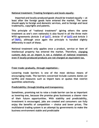 The WTO agreements establish principles for international trade including non-discrimination through most-favored-nation status and national treatment. They aim to promote fair competition through rules on dumping, subsidies, and intellectual property protection. The agreements cover trade in goods, services, and intellectual property through agreements like GATT, GATS, and TRIPS, with the goal of gradually liberalizing trade through negotiation and making the trading system more predictable and transparent.