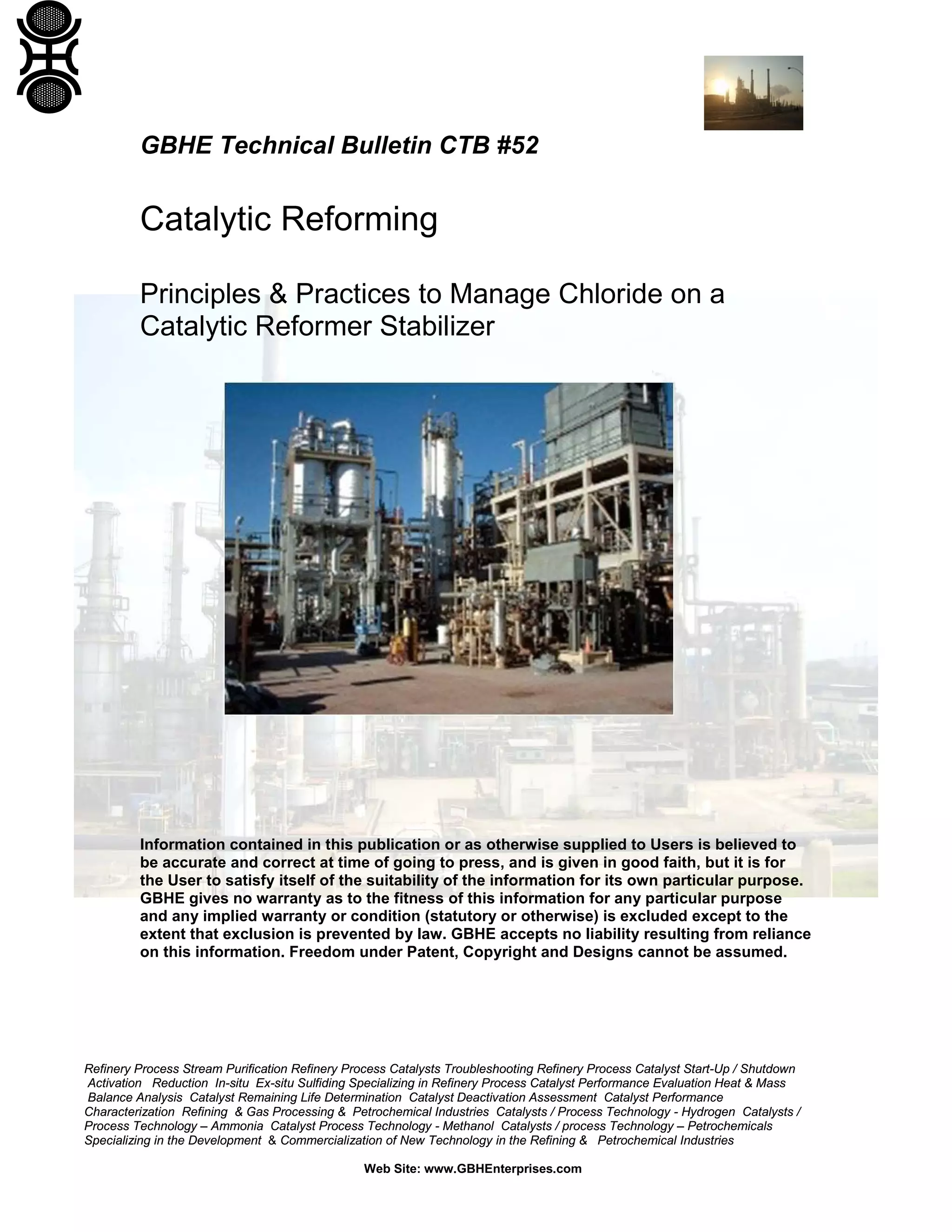 The document discusses challenges and solutions in refinery process stream purification, particularly focusing on chloride management in catalytic reformers. It highlights problems associated with NH4Cl salt formation and its mitigation strategies, including nitrogen and chloride removal, as well as water injection to prevent plugging, despite its potential to cause HCl corrosion. Various methods and technologies for improving catalyst performance in the refining and petrochemical industries are also explored.