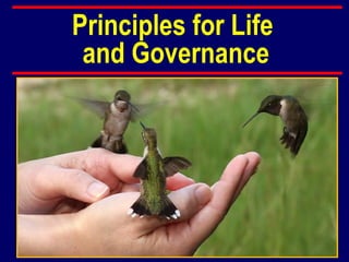 1. The document discusses principles for life and governance, stating that people should be governed by their conscience and reason, upholding natural law and rights.
