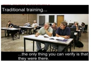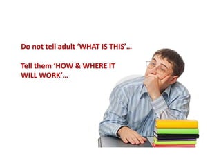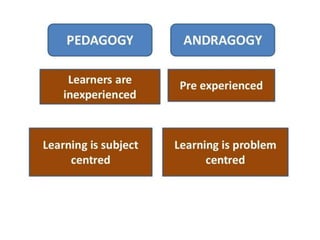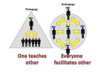 The document discusses principles of adult learning. It states that adult learning is autonomous, self-directed, goal-oriented, and draws on life experiences. Effective adult learning involves making the content relevant, problem-centric, and fun while creating a supportive environment. Active learning techniques like discussion and activities are more effective than passive listening.