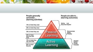 The document discusses the principles of learning, emphasizing that learning is a continuous process that involves acquiring knowledge, skills, and attitudes through various means such as training, experience, and exploration. It distinguishes between training, development, education, and learning while outlining key learning principles like readiness, exercise, effect, primacy, recency, intensity, requirement, and freedom. Effective learning relies on positive emotional experiences, meaningful practice, initial correct impressions, and the ability to learn freely.