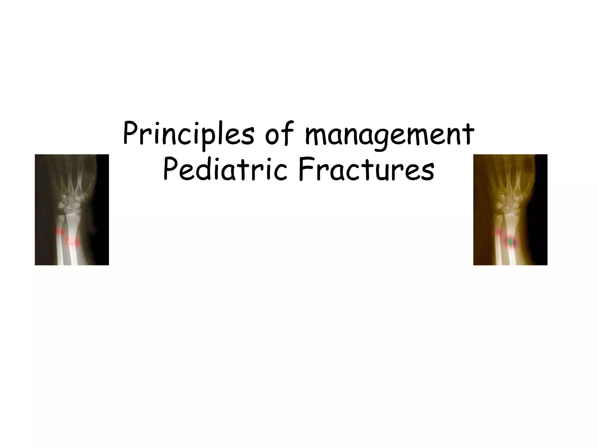 Fractures are common in children, accounting for about 15% of injuries. Children's bones differ from adults' due to factors like growth plates and increased remodeling potential. Principles of management include restoring alignment while allowing healing and growth. Common treatment plans involve casting, K-wires, elastic nails or screws. Precautions are needed for physeal injuries, non-accidental trauma, and rare tumors that can mimic fractures.