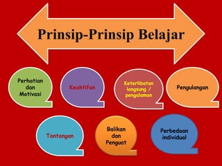 Dokumen ini membahas prinsip-prinsip belajar yang mencakup perhatian, motivasi, keaktifan, pengulangan, tantangan, dan perbedaan individual. Penekanan pada keterlibatan siswa secara aktif dalam proses belajar serta peran guru sebagai pembimbing ditonjolkan, dengan motivasi dari siswa menjadi faktor kunci dalam pembelajaran. Implikasi dari prinsip-prinsip ini untuk siswa dan guru meliputi penggunaan metode bervariasi, media sesuai tujuan, dan perhatian terhadap kebutuhan individual siswa.