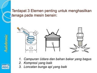 Tiga elemen penting untuk menghasilkan tenaga pada mesin bensin adalah campuran udara dan bahan bakar yang tepat, kompresi yang baik, dan loncatan bunga api yang tepat. Kontrol komputer diperlukan untuk mengkoordinasikan ketiga elemen tersebut secara bersamaan melalui sensor masukan dan aktuator keluaran seperti injektor dan koil. Sistem pengontrolan mesin modern seperti injeksi bahan bakar, pengapian, gas buang, dan