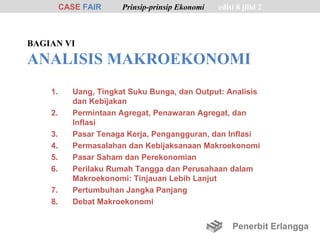 Buku ini membahas tentang analisis makroekonomi, termasuk hubungan antara pasar barang dan pasar uang, permintaan agregat, penawaran agregat, dan inflasi. Bab-babnya menjelaskan tentang bagaimana tingkat suku bunga mempengaruhi investasi dan output agregat, serta kurva permintaan agregat dan penawaran agregat dalam menentukan tingkat harga ekuilibrium."