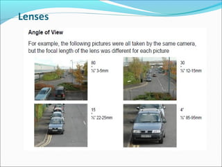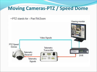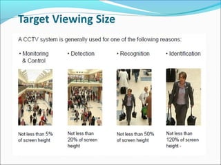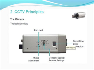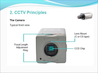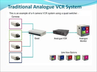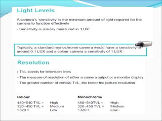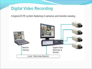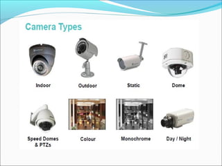 The document discusses closed-circuit television (CCTV) systems, including their purpose for monitoring and deterring crime, as well as explaining the basic components and technology of both analogue and digital systems. Key characteristics include types of cameras, the significance of image sensors, and the advantages of digital video recorders (DVRs) over older analogue systems. Additionally, it highlights considerations for recording duration, camera features, and the importance of data protection regulations.