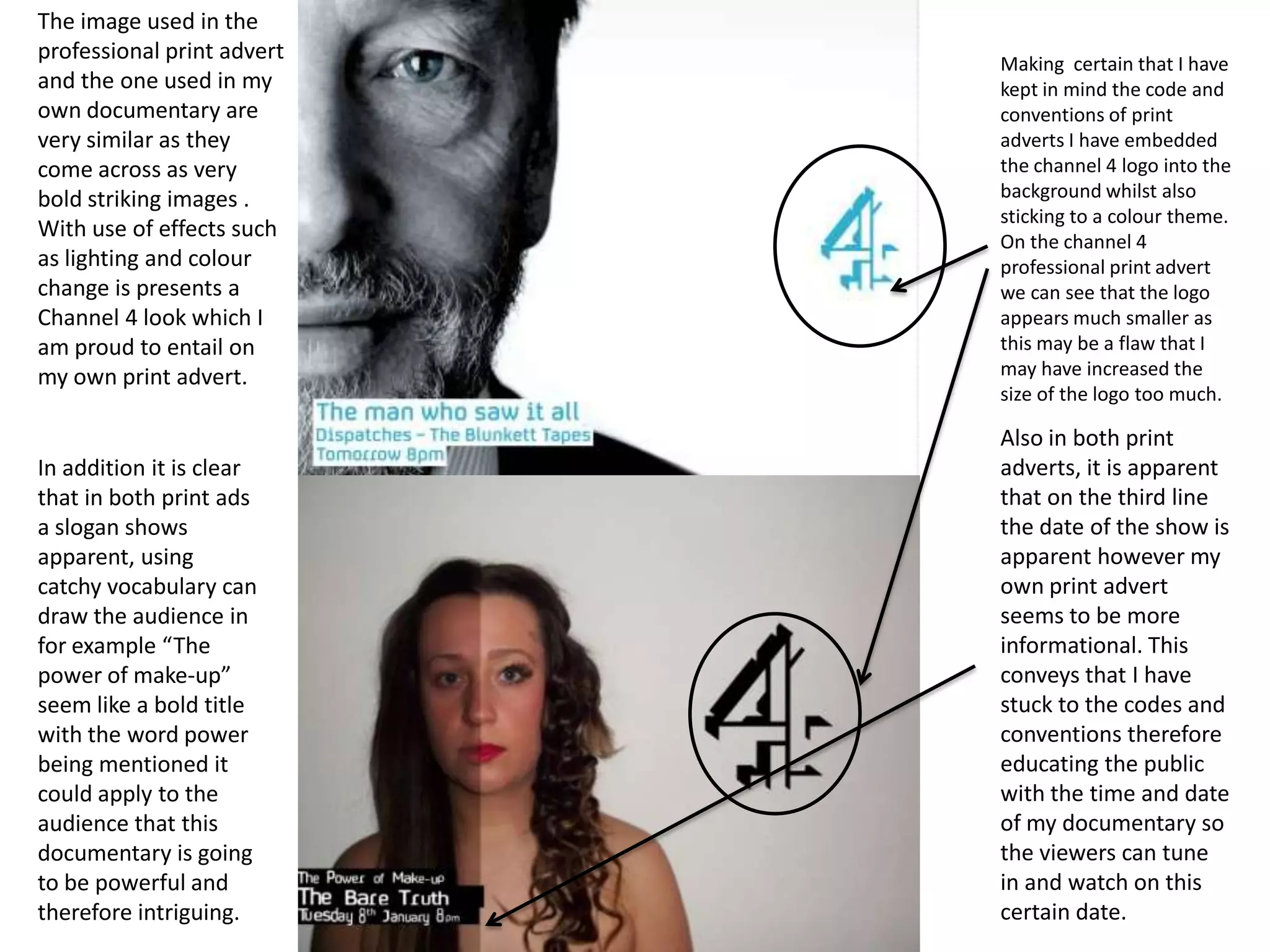 The summary compares the image and design of an advertisement for the documentarian's own documentary to a professional Channel 4 advertisement. Both use bold, striking images and feature the Channel 4 logo. The documentarian aimed to follow conventions of print ads, including embedding the logo, using similar lighting and color schemes, and including a slogan and air date. However, the documentarian notes the logo may be too large in their version. The summary conveys the documentarian sought to mimic the professional ad's style while also providing more information to educate viewers on when to tune in.