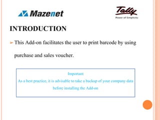 The document outlines an add-on that allows users to print barcodes using purchase and sales vouchers in Tally. It includes a setup guide that describes the necessary steps to configure the add-on and initiate barcode printing. The document also emphasizes the importance of backing up company data before installation.