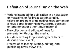 Journalism involves collecting, verifying, and reporting information about current events and issues in an objective manner for publication or broadcast. It aims to provide an accurate account of timely events or problems that interest many readers or viewers. The key elements of news include who, what, when, where, why, and how regarding significant events. Factors like timeliness, impact, prominence, proximity, conflict, and the unusual influence what gets selected as news. News stories follow a structure with an intro, body, and conclusion and aim to uphold journalistic values like accuracy, attribution, objectivity, and fairness.