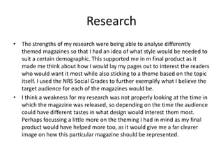 Joe Duffy evaluated his magazine project. For research, he analyzed different magazines to understand appropriate styles for different demographics. However, he did not properly consider the magazines' release times. For planning, he had a clear topic idea early on, but did not plan page layouts sufficiently. Later project phases slowed as layouts had to be developed. While initial time management was good, production slowed due to technical issues. However, he was able to complete the cover on time. For technical qualities, he used images and formatting to make text inviting, while the comparison magazine used large blocks of small text. For aesthetic qualities, he incorporated game elements creatively and created a unique rotoscope cover, though wanted more advertising space. He