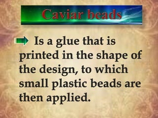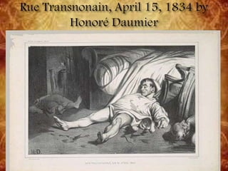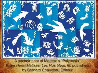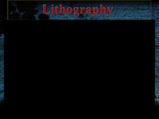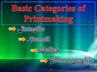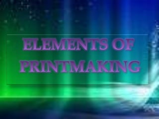 Printmaking is the process of making multiple artworks through various techniques involving transferring ink from a matrix or screen onto paper or other material. The main printmaking techniques discussed include intaglio methods like engraving, etching, mezzotint and aquatint where ink is pressed into lines or tones on a plate before printing; lithography which uses the repulsion of oil and water to create images on stone or metal plates; and screenprinting which forces ink through a fabric stencil using a squeegee. Artists over centuries have experimented with these techniques to produce artistic prints.