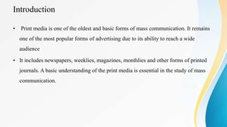 This document provides an overview of print media, including its history and various types. It discusses how print media has evolved from handwritten manuscripts to digital technologies. It then describes different forms of print media like newspapers, magazines, newsletters, books, and posters. Newspapers are highlighted as one of the most important print media, providing information, education, and other services to communities. The functions and types of newspapers, magazines, and other materials are outlined. Finally, various terminology used in print media are defined.