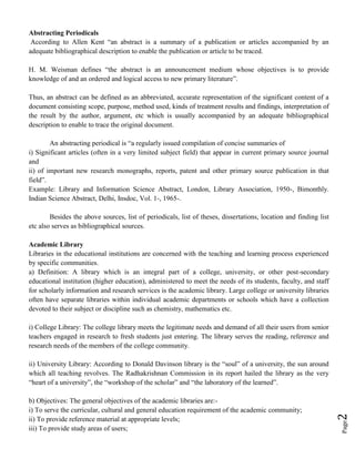 This document discusses academic libraries and their role, functions, and services. It defines academic libraries as libraries that are part of colleges, universities, or other post-secondary institutions and are administered to meet the needs of students, faculty, and staff for scholarly information and research. It describes the objectives, collections, and services of both college libraries and university libraries. Key services discussed include reference, lending, and information services to support the educational mission of the parent institution.